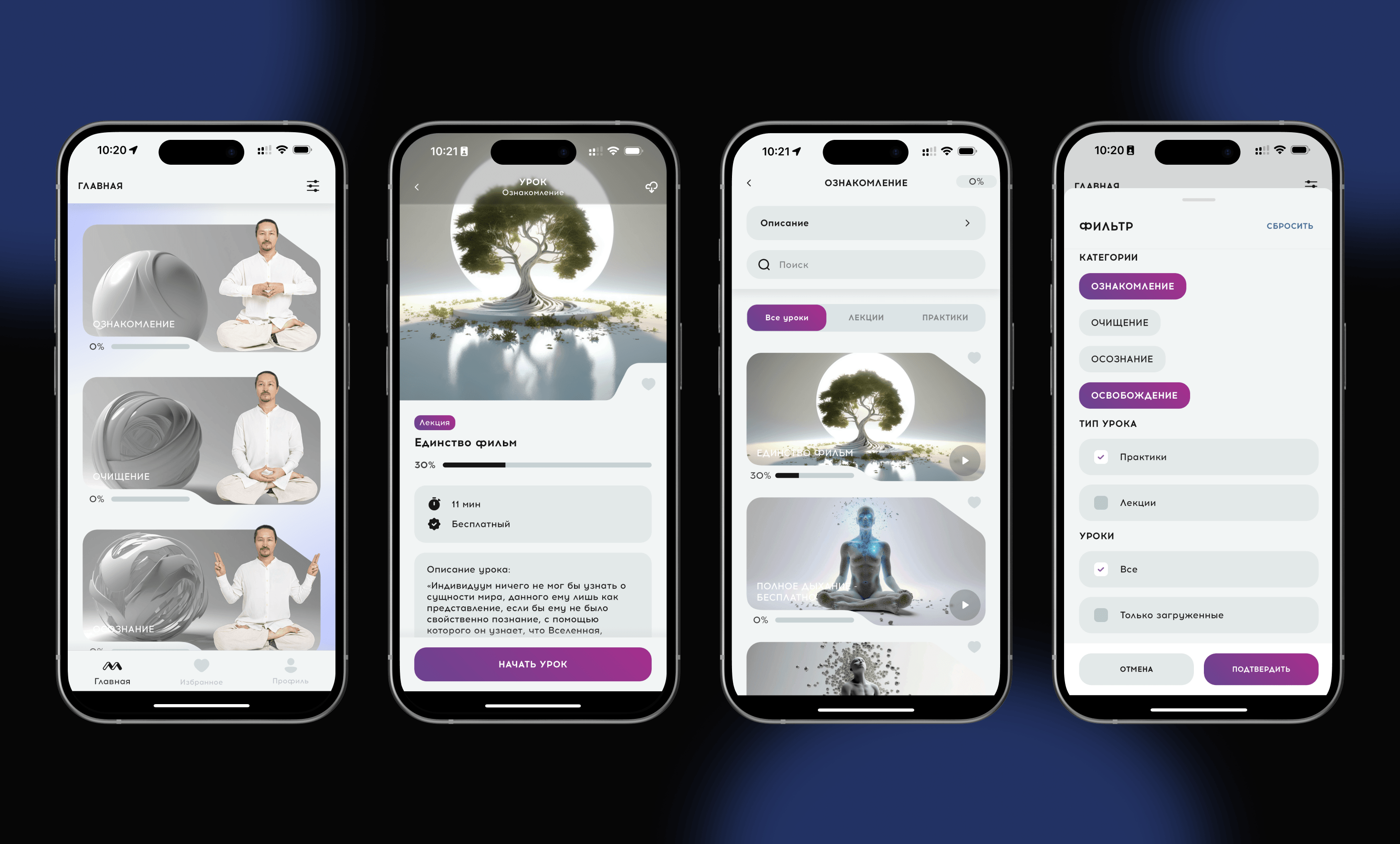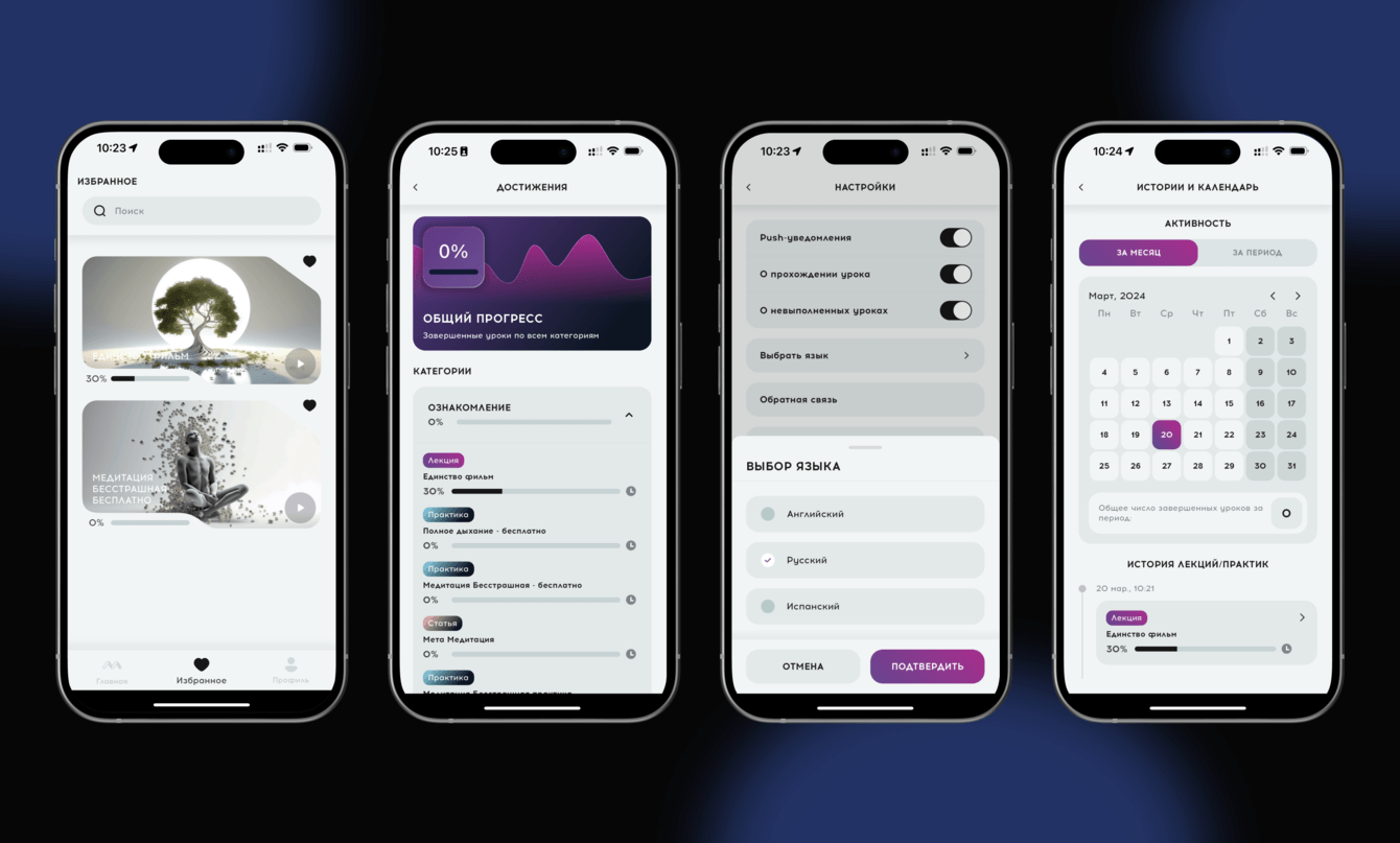 К нам обратилась онлайн‑школа по медитации с запросом на создание собственного мобильного приложения. Задача — сделать удобный инструмент, через который пользователи смогут проходить медитационные курсы: слушать лекции, выполнять практики, отслеживать прогресс и открывать достижения.
