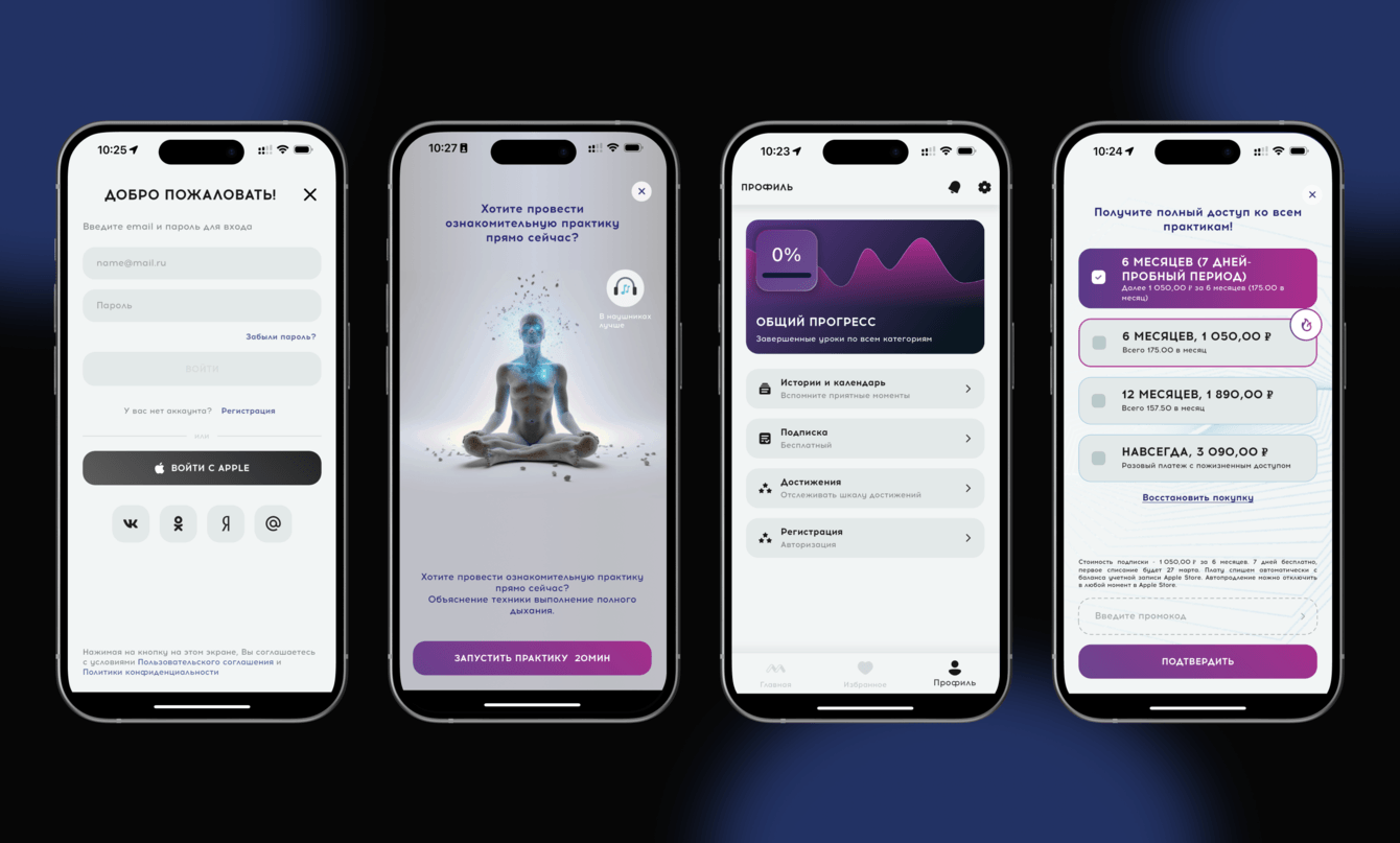 Мы разработали стабильное и эстетичное мобильное приложение для регулярной практики медитации — с понятным пользовательским путём, подпиской, системой достижений и прогресса.
