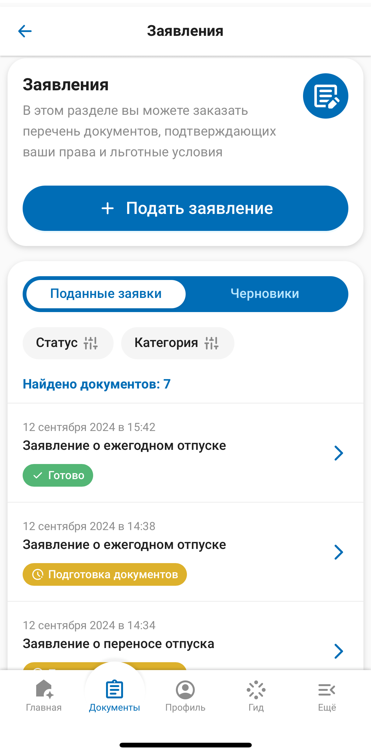 - подача заявлений на отпуск;
