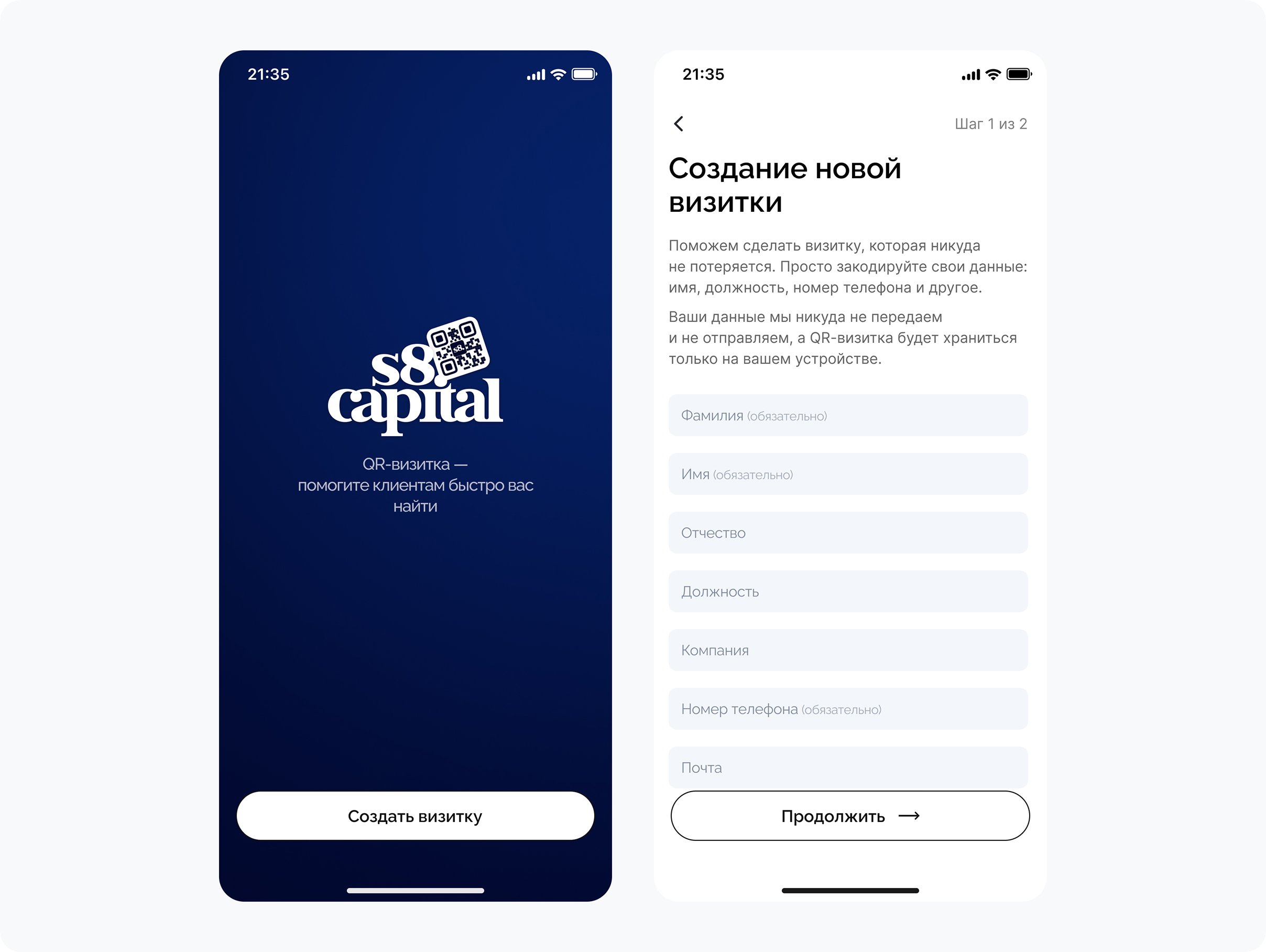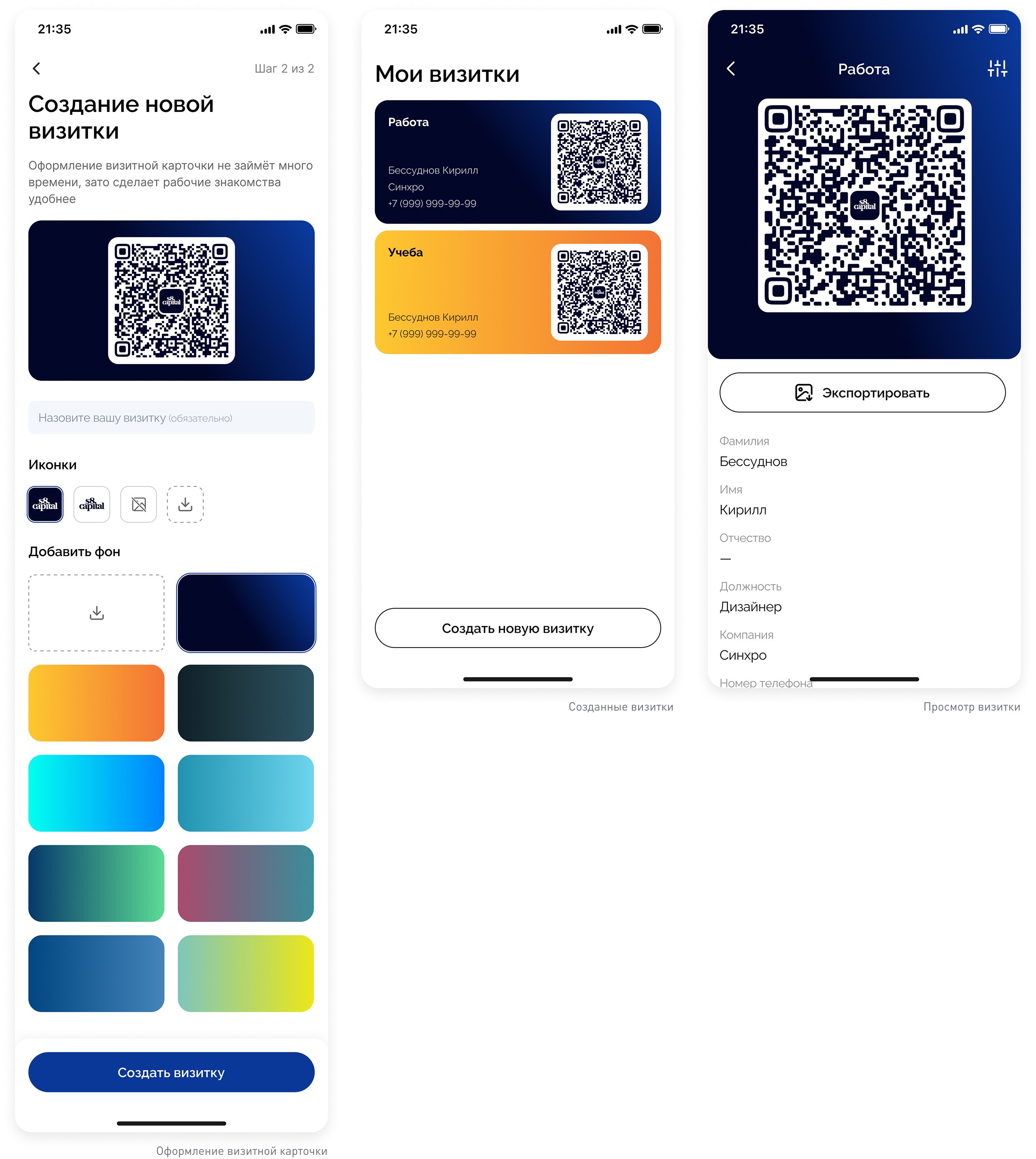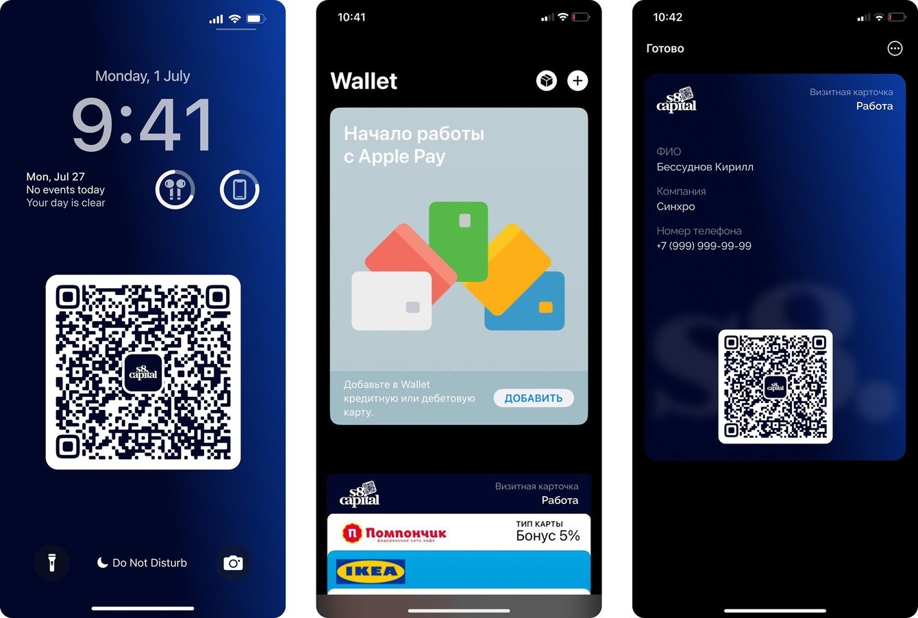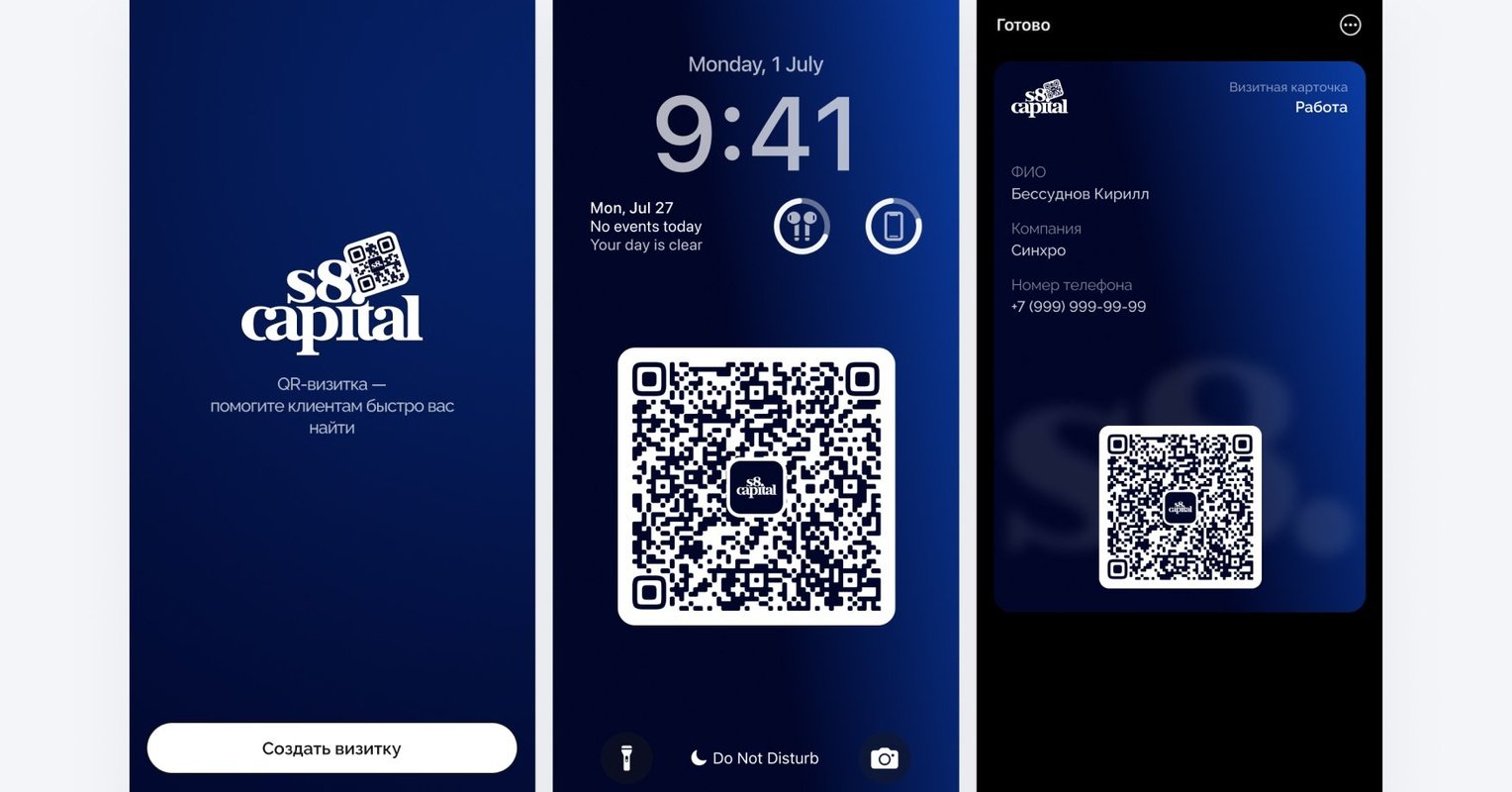 Компания “Синхро” разработала приложение для обеих мобильных платформ (Android, iOS), позволяющее генерировать QR-код c контактными данными для сотрудников холдинга S8 Capital. Приложение позволяет пользователю в пару кликов сформировать визитку в формате vCard, который принимается обеими платформами (Android, iOS), сохранить её в Apple Wallet или Google Pay, скачать в Альбомы как картинку или подготовить для размещения на экран блокировки телефона.