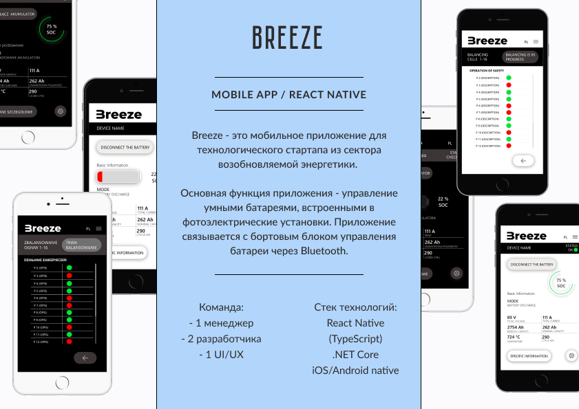 Breeze — мобильное приложение для технологического стартапа в сфере возобновляемой энергетики. Основная функция — управление умными батареями, встроенными в фотоэлектрические установки. Приложение подключается к бортовому контроллеру батареи через Bluetooth для мониторинга и управления.