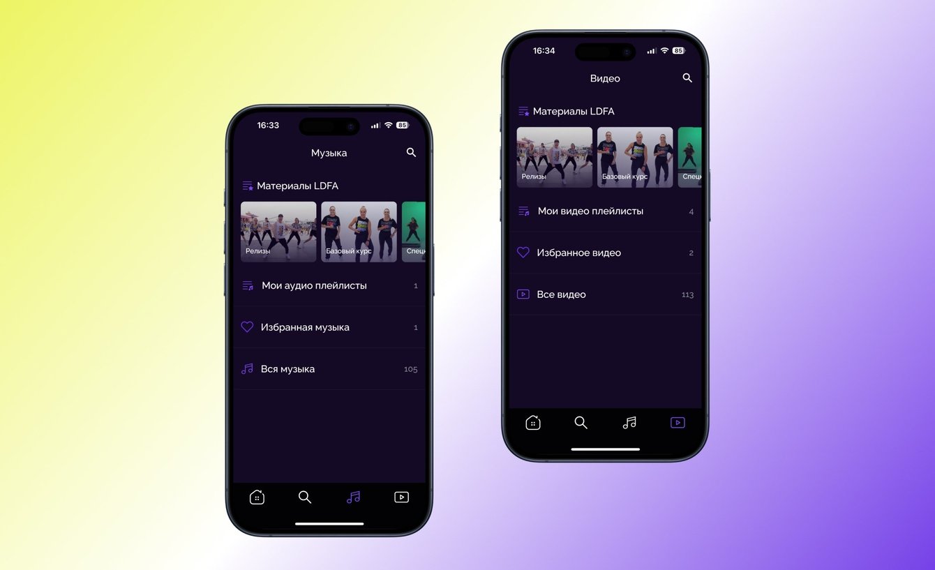 Музыка и видео добавляется из релизов и по результатам поиска, а также из памяти на Android, и сохраненных треков в Apple Music на iOS. Для этого пользователям доступны материалы курсов и других обучений на специально созданных экранах, которые открываются внизу через панель навигации.