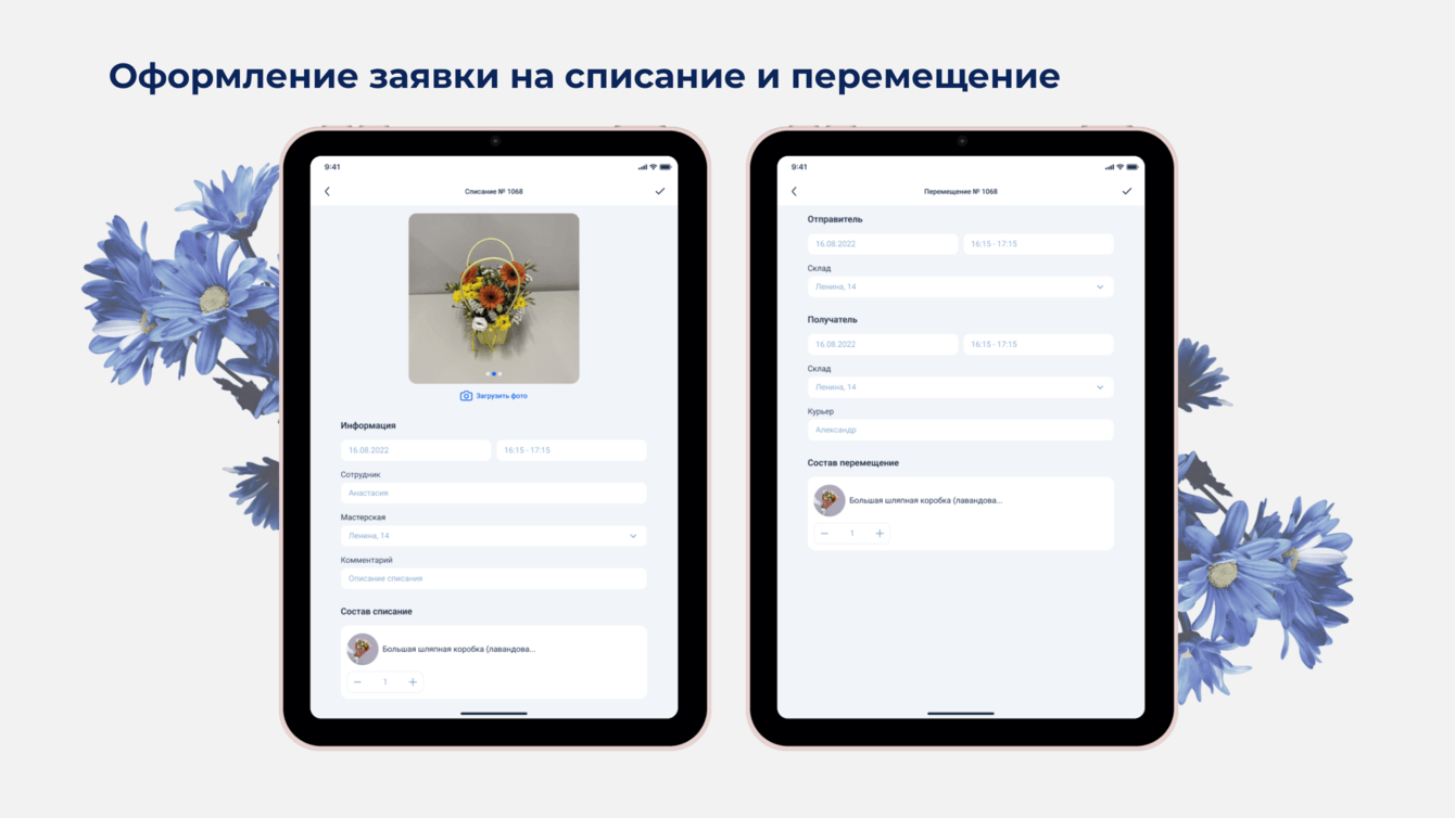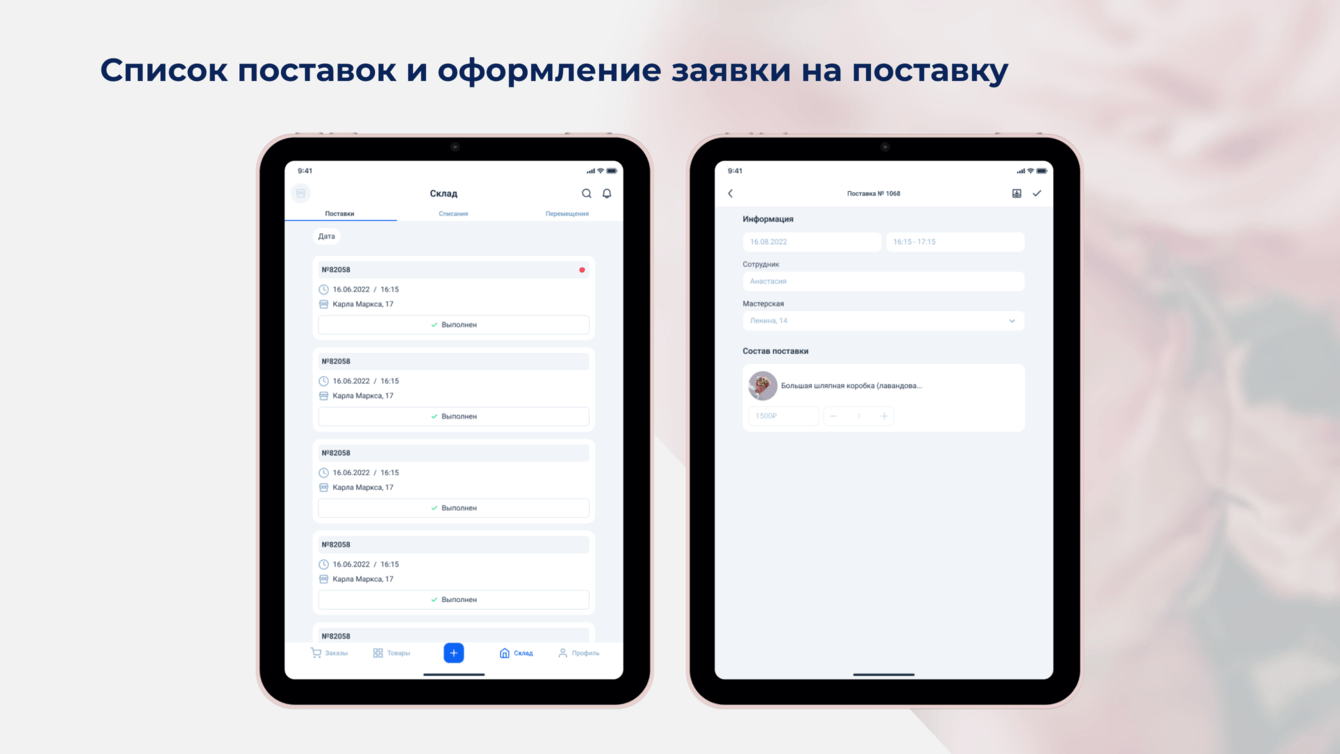 Позволяет осуществлять управление поставками. Используя интерфейс приложения, флорист может сформировать заказ на поставку со склада, в котором указывает состав поставки, дату и время поставки, какой сотрудник будет ее принимать, в какую мастерскую доставить.