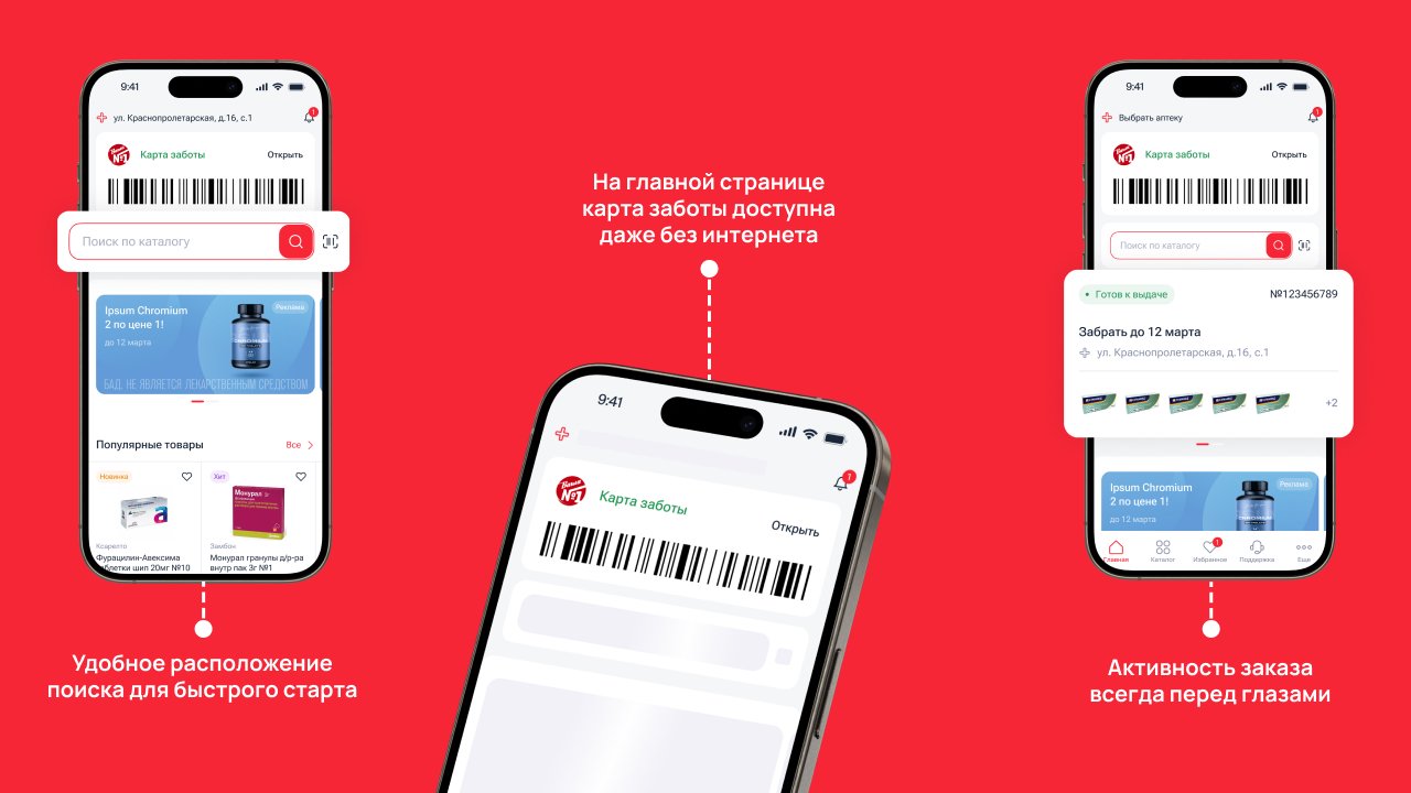 При этом важные функции оставили на виду. Например, на главной странице есть быстрый доступ к «Карте заботы», что позволяет мгновенно открывать ее на кассе — карта позволяет получать фиксированную скидку. Ниже располагается поиск — он появляется на главном экране и закрепляется в топе при скроллинге каталога.