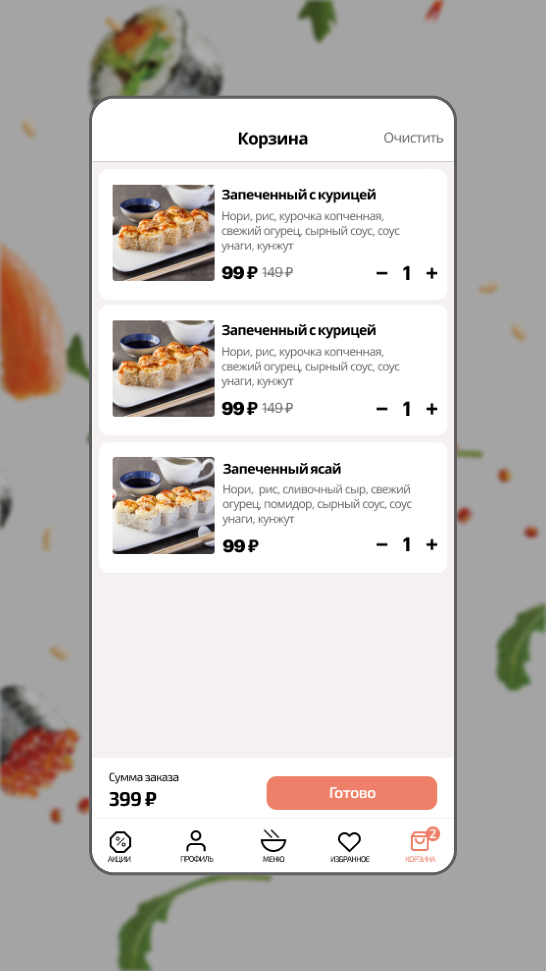 просматривать меню с роллами, сетами, напитками и дополнительными блюдами;