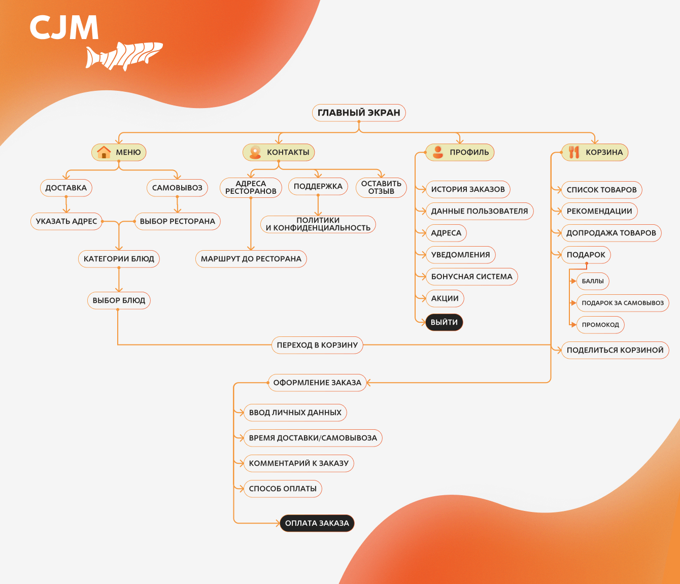 Работа над интерфейсом началась с проектирования пользовательских сценариев: от первого входа в приложение до получения заказа. Мы продумали путь клиента так, чтобы каждый следующий шаг был очевиден, а навигация оставалась естественной.