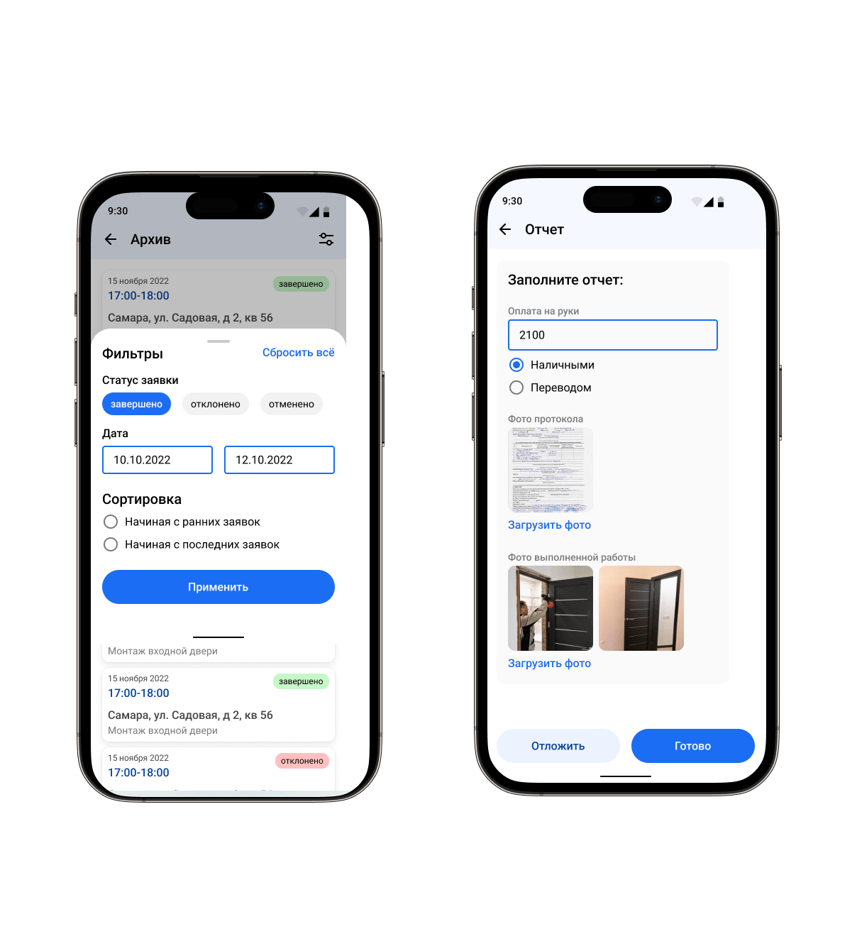 Формирование отчетов — после завершения заказа приложение требует обязательного заполнения отчета по заранее заданным полям, что помогает избежать потери данных и обеспечивает высокое качество контроля работ.
