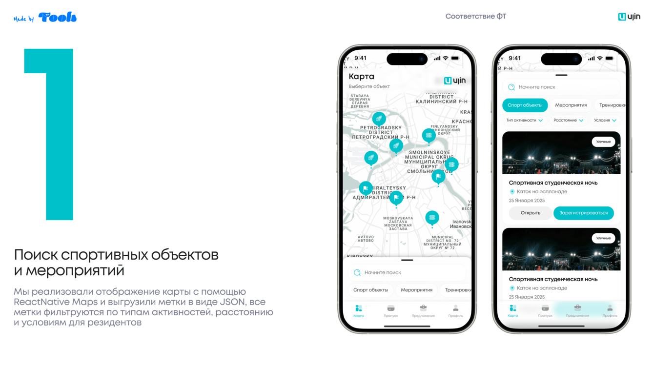 Разработать сервис для поиска ближайших спортивных объектов и мероприятий с возможностью оформления пропуска через систему Ujin.