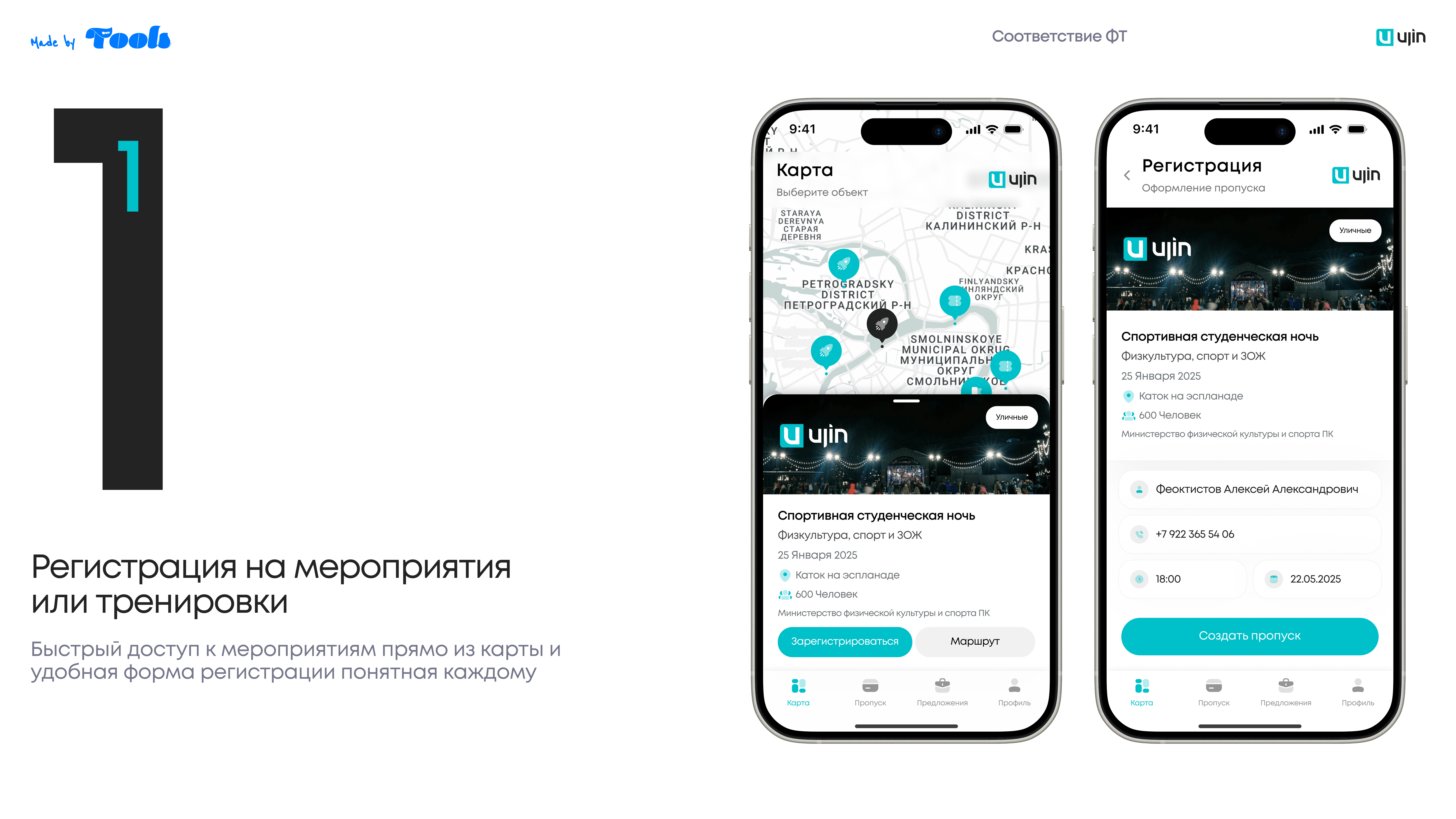 Разработать сервис для поиска ближайших спортивных объектов и мероприятий с возможностью оформления пропуска через систему Ujin.