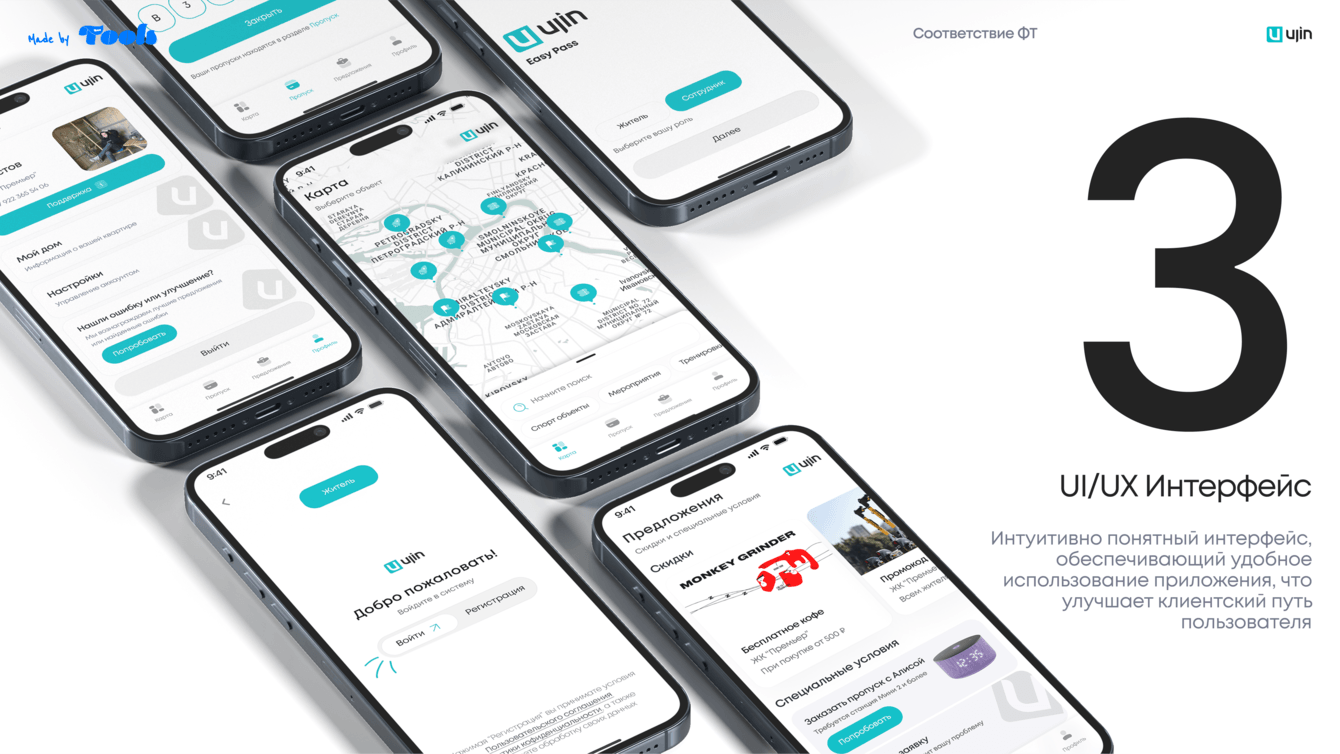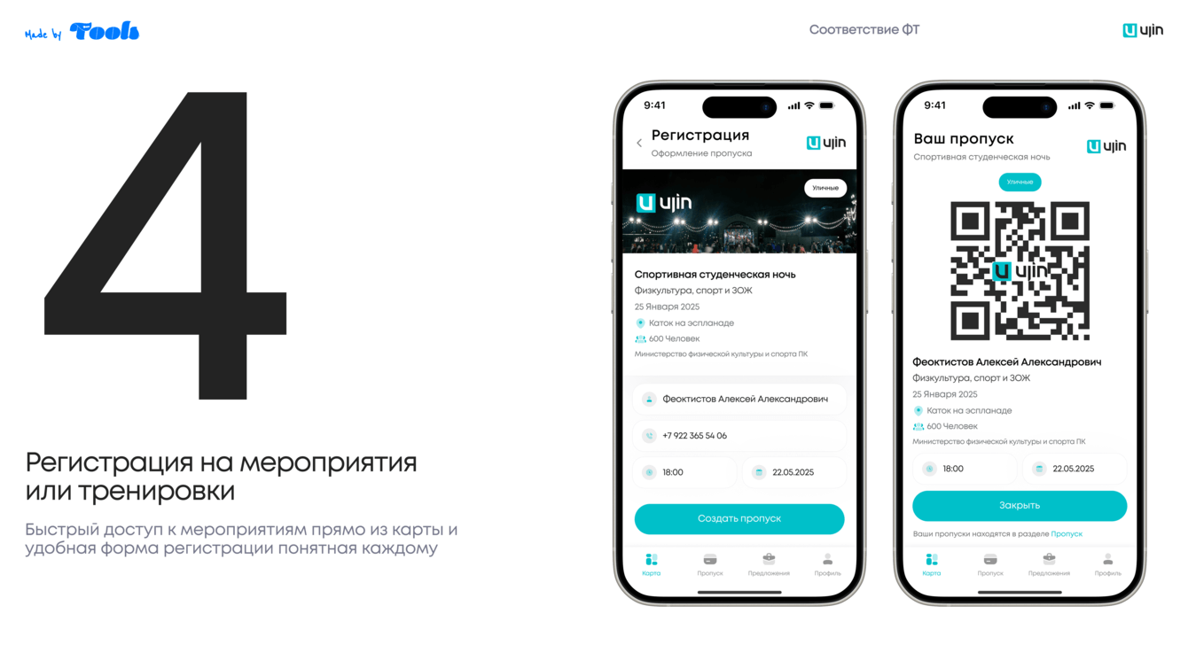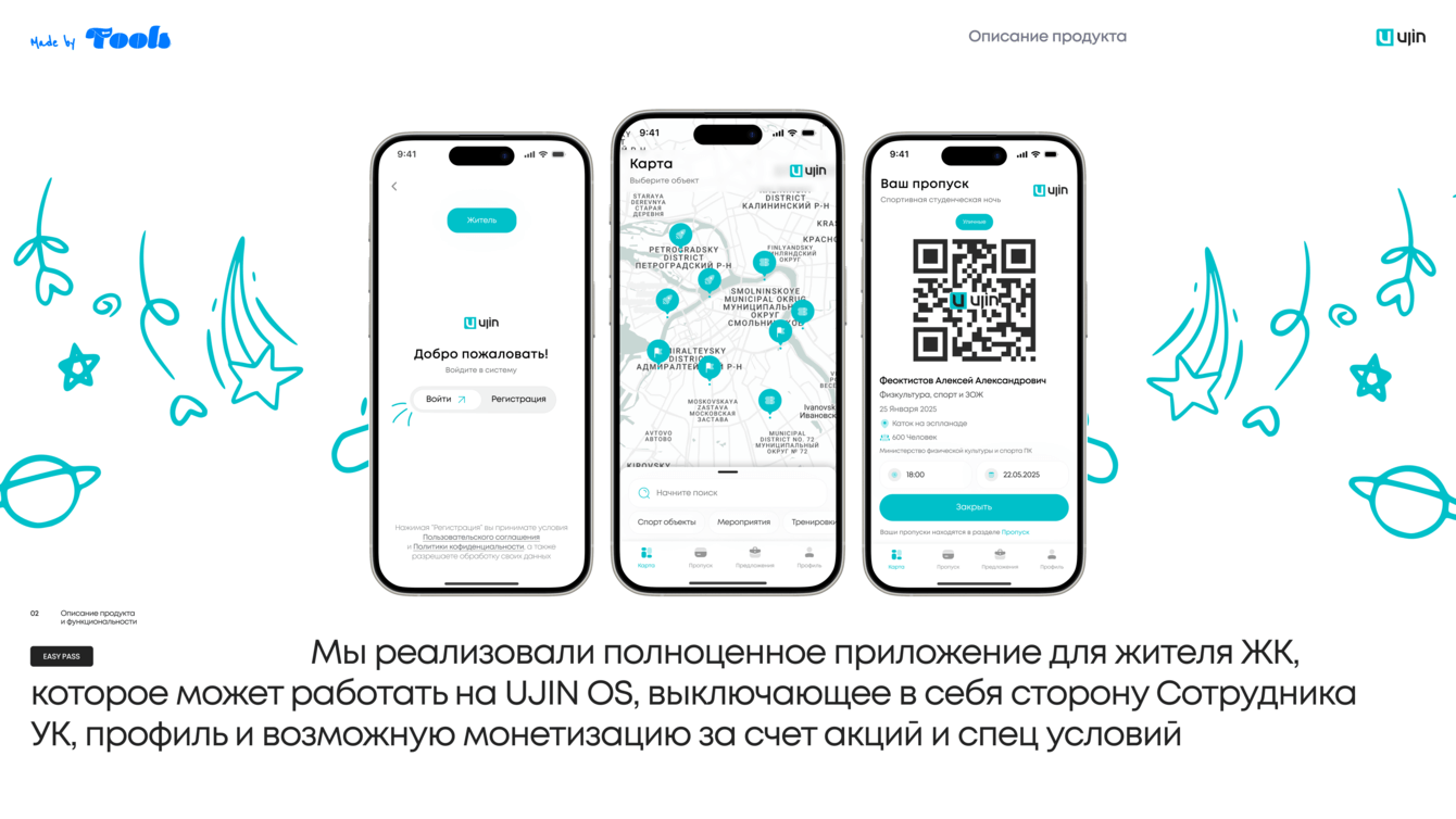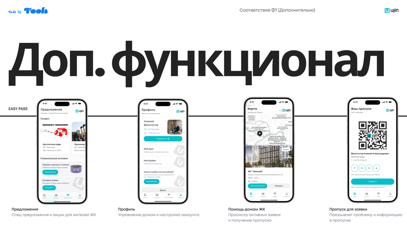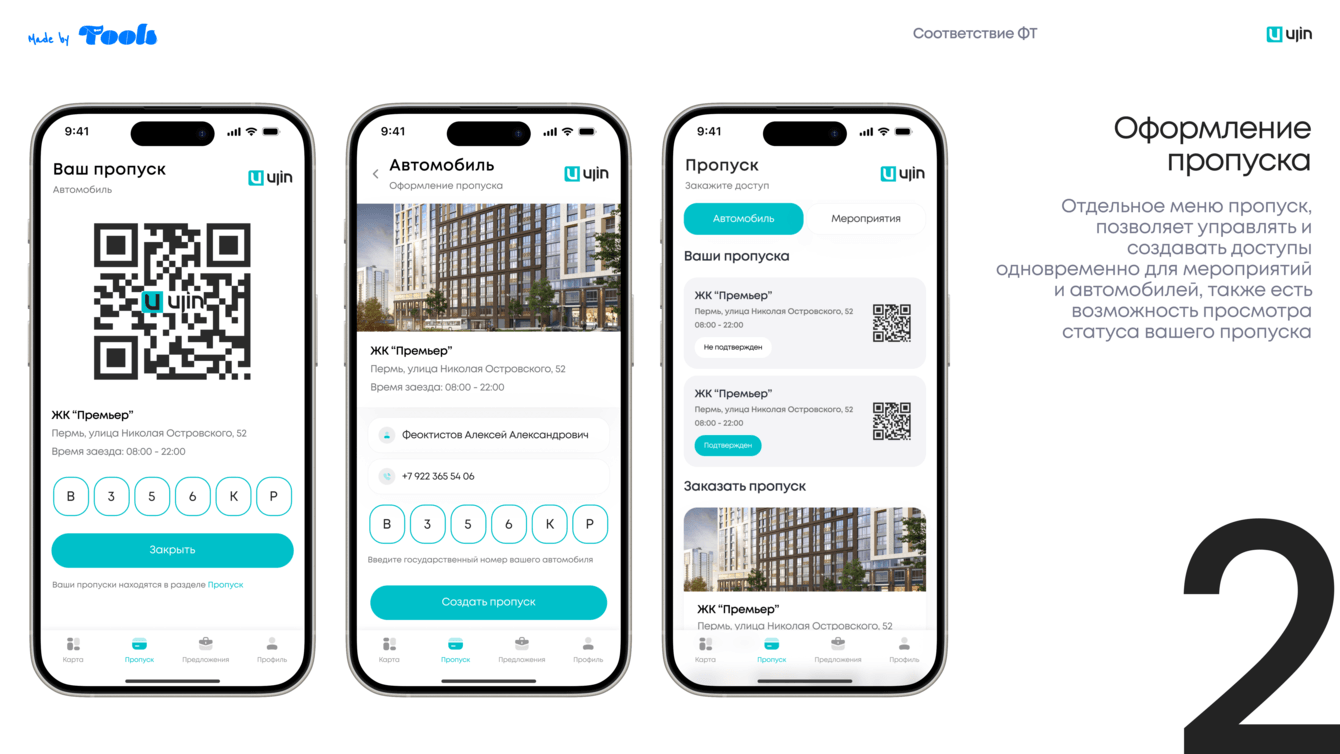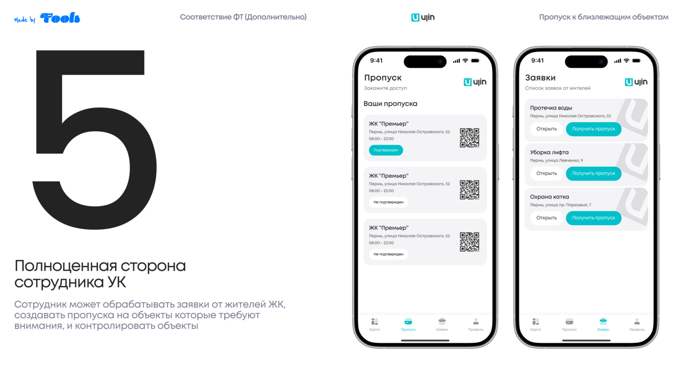• Генерация QR-кода или виртуального пропуска, одобренного УК/Ujin