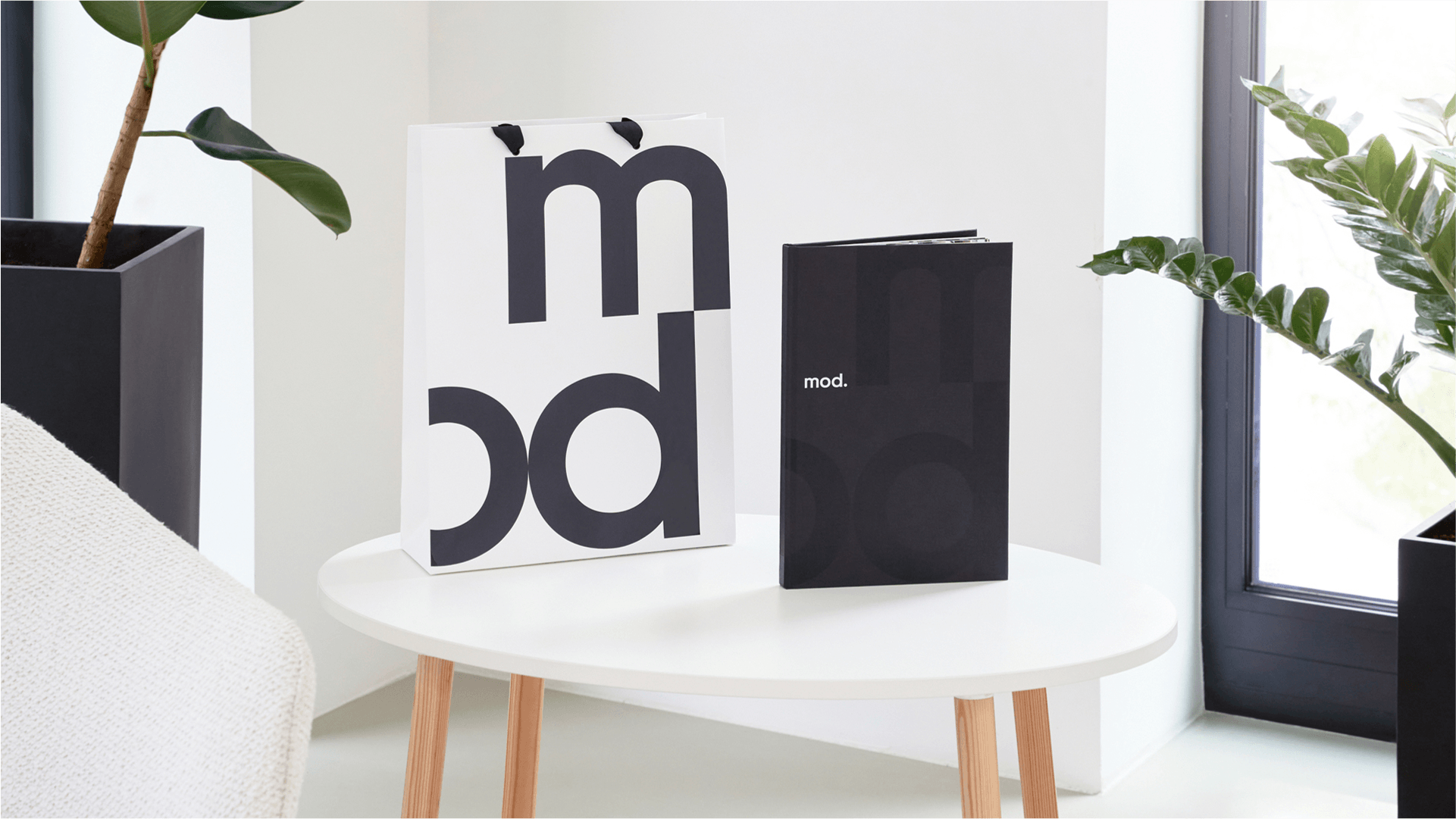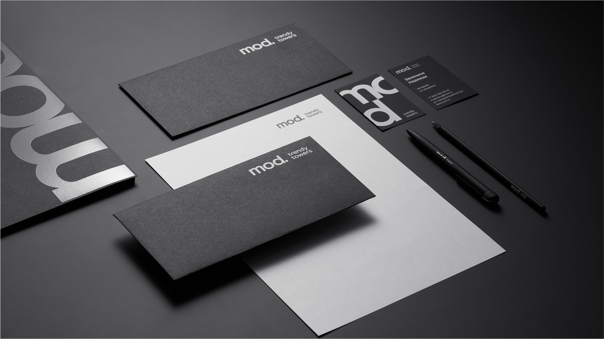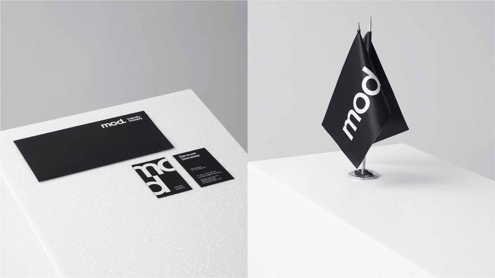 Дизайн брендингового проекта построен на контрасте форм. Графика бренда основана на стильной игре черного и белого, глянцевых и матовых поверхностей. Выверенный минимализм и пронизывающая самоуверенность — отражение характера MOD.