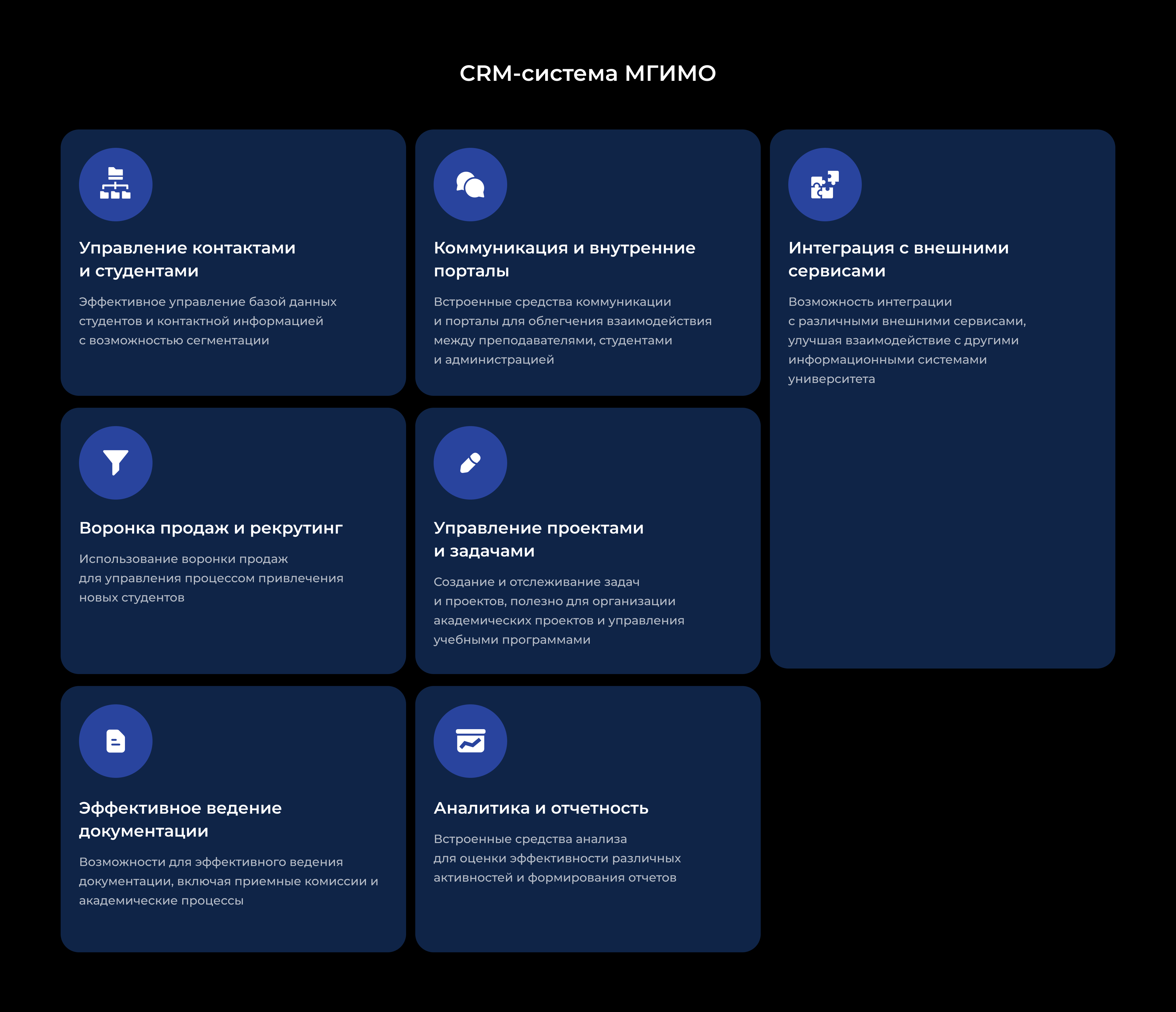 Цель внедрения CRM-системы в Школе бизнеса МГИМО – создать простой и эффективный инструмент для отслеживания активности клиентов, улучшения коммуникаций и предоставления персонализированного подхода.