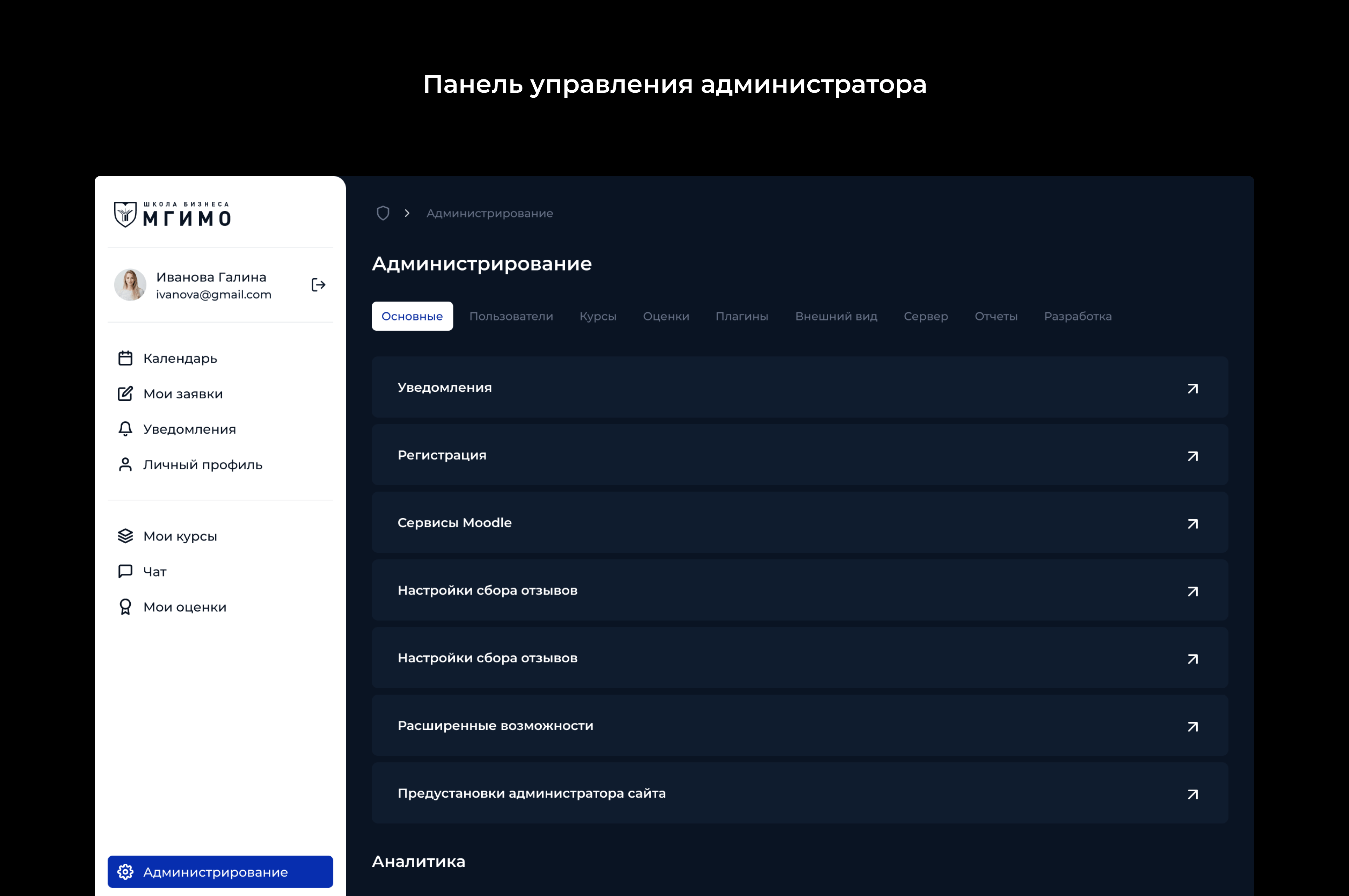 Успешное развертывание программного обеспечения стало ключевым моментом для управления образовательным процессом. Система обладает широким функционалом, включая управление курсами, проверку освоения программы, выгрузку аналитических отчетов, а также администрирование образовательного процесса.