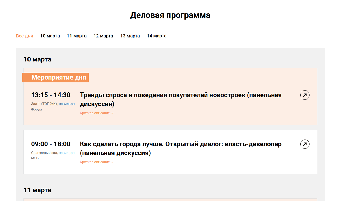 В рамках реализации для публичной части сайта мы разработали отдельный шаблон-конструктор сложного мероприятия.