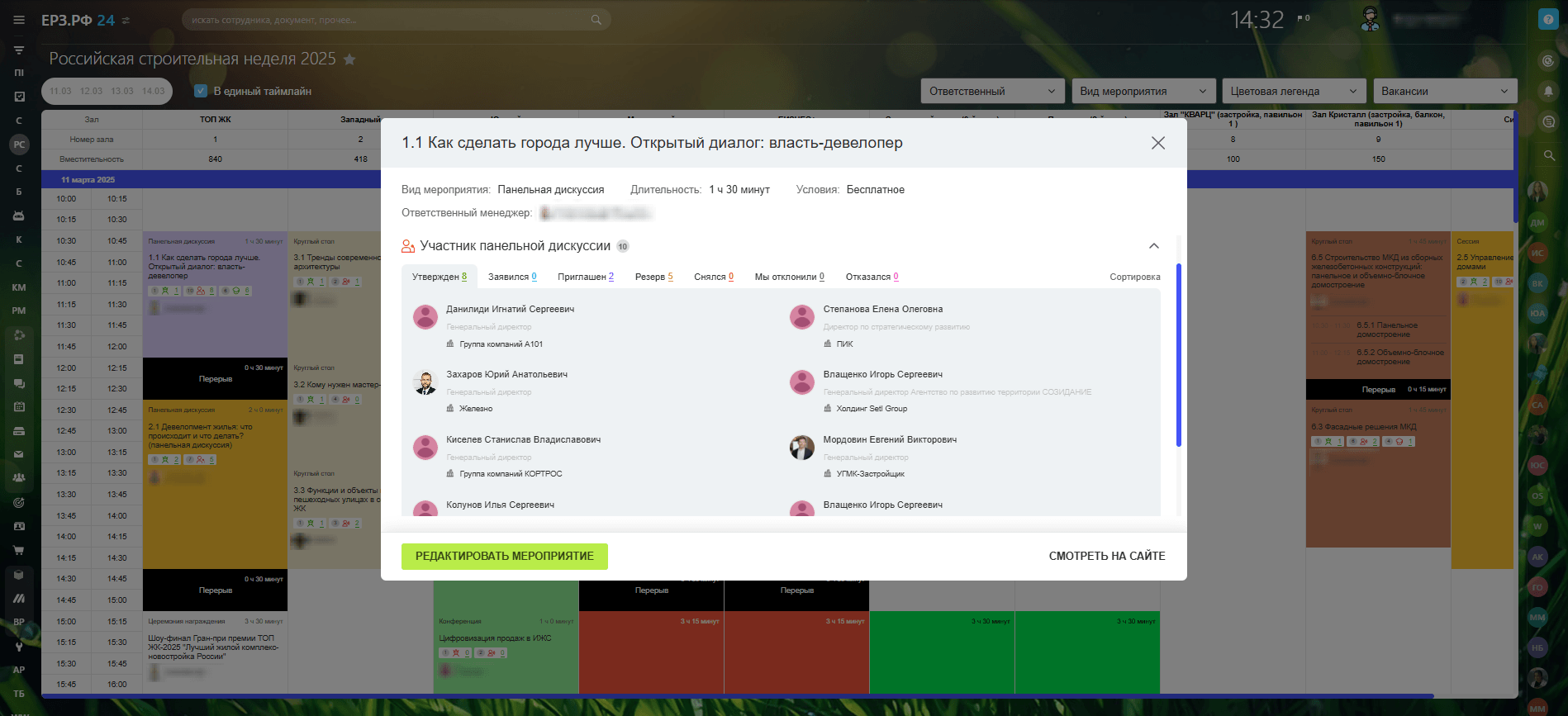Перед нами стояла задача разработать отдельный функционал планирования проведения сложных мероприятий в Битрикс24, чтобы автоматизировать и централизовать управления сложными многособытийными мероприятиями, включая планирование, визуализацию расписания, синхронизацию с CRM и сайтом, а также контроль за участниками и докладами.