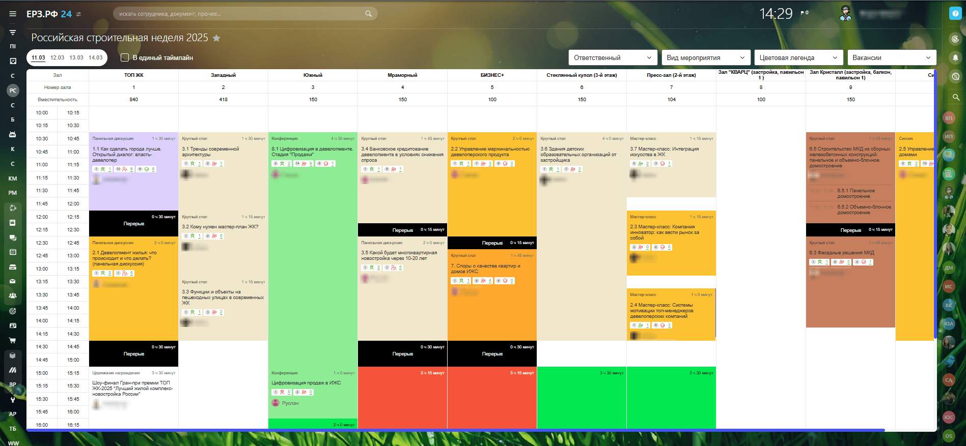 - Автоматизация расписания. Распределение мероприятий по дням, времени, залам и направлениям.