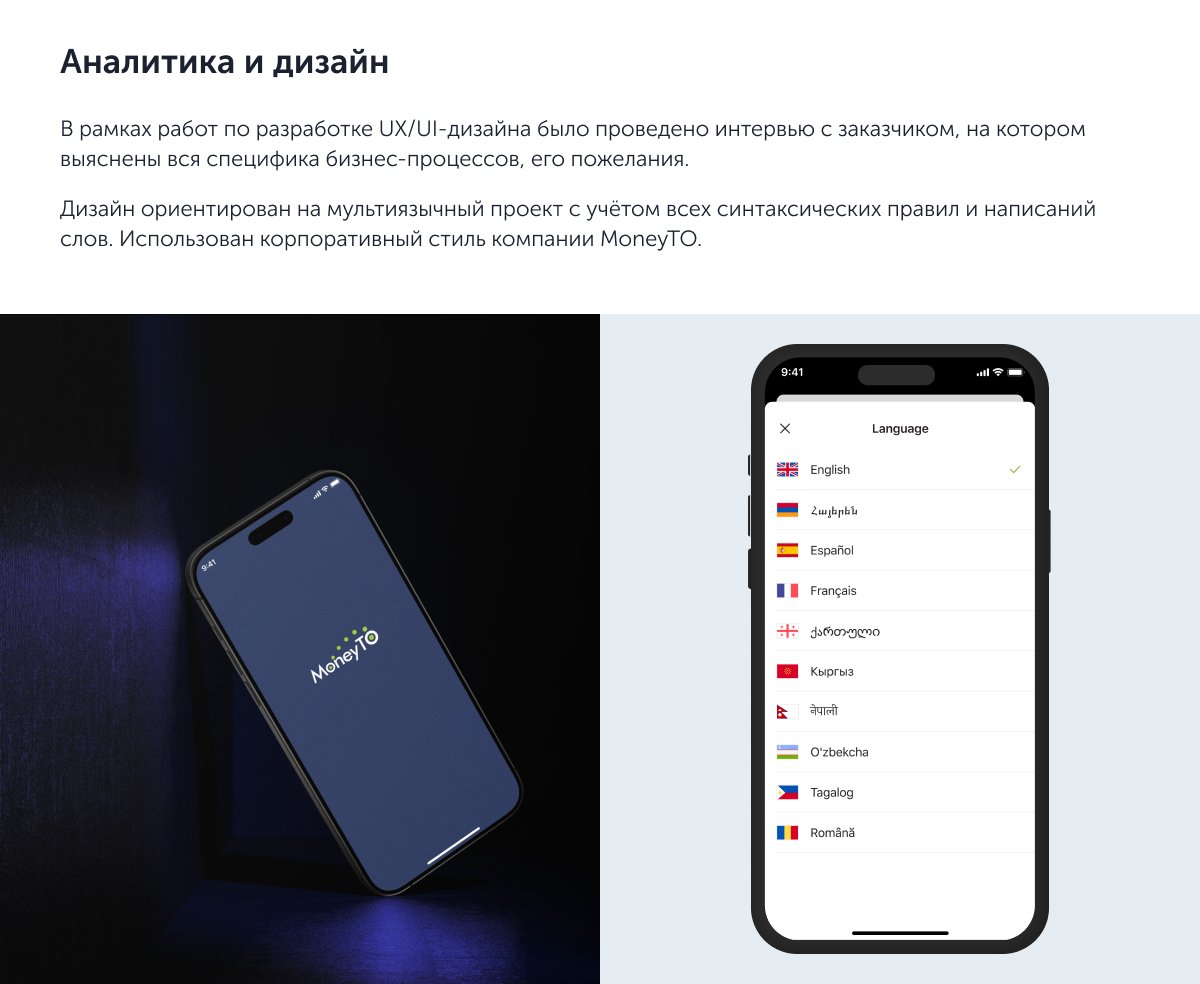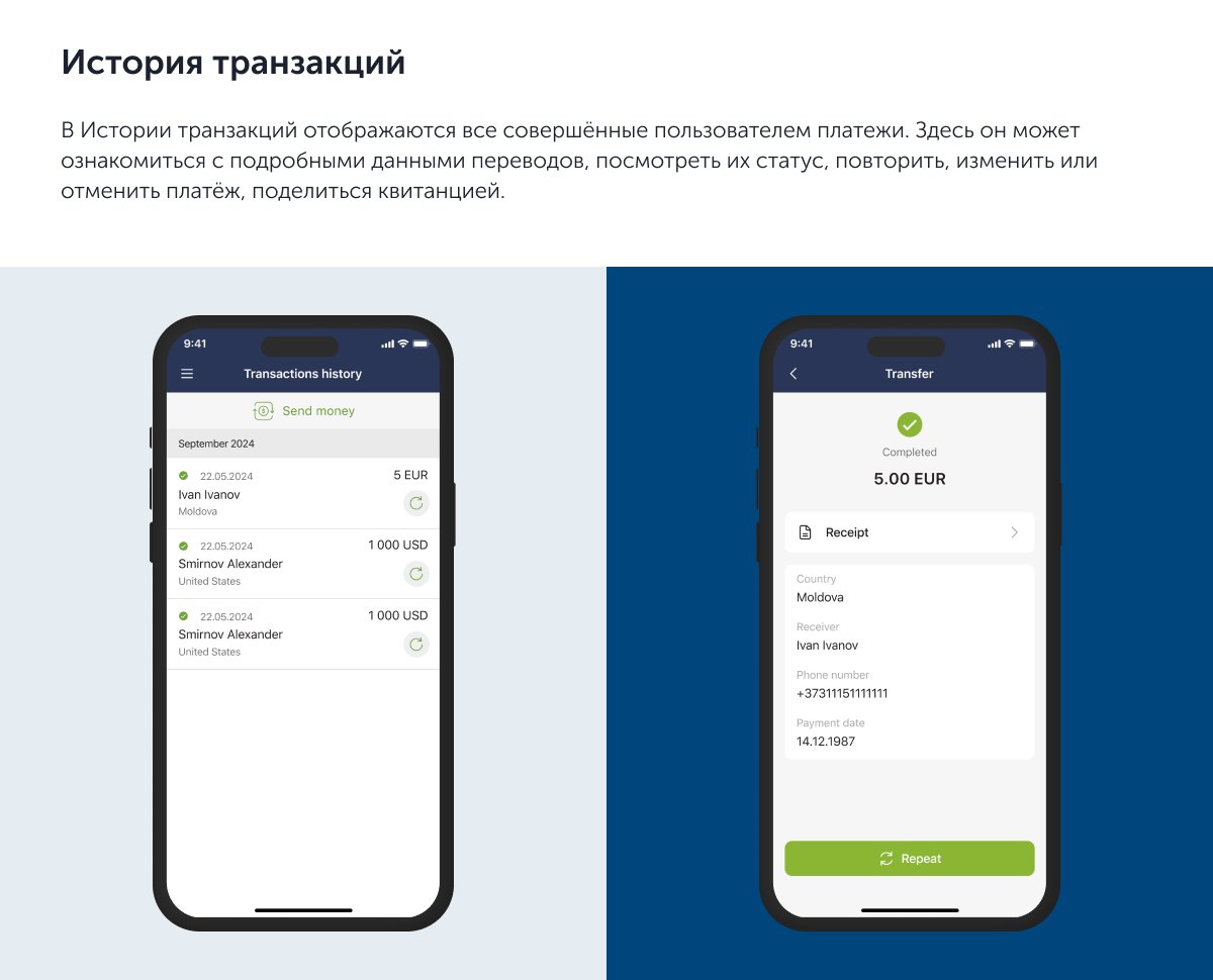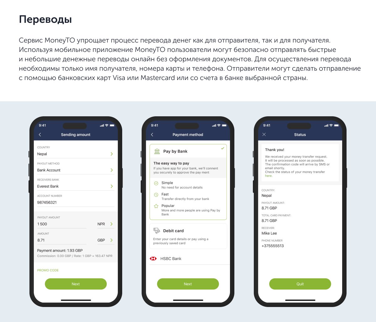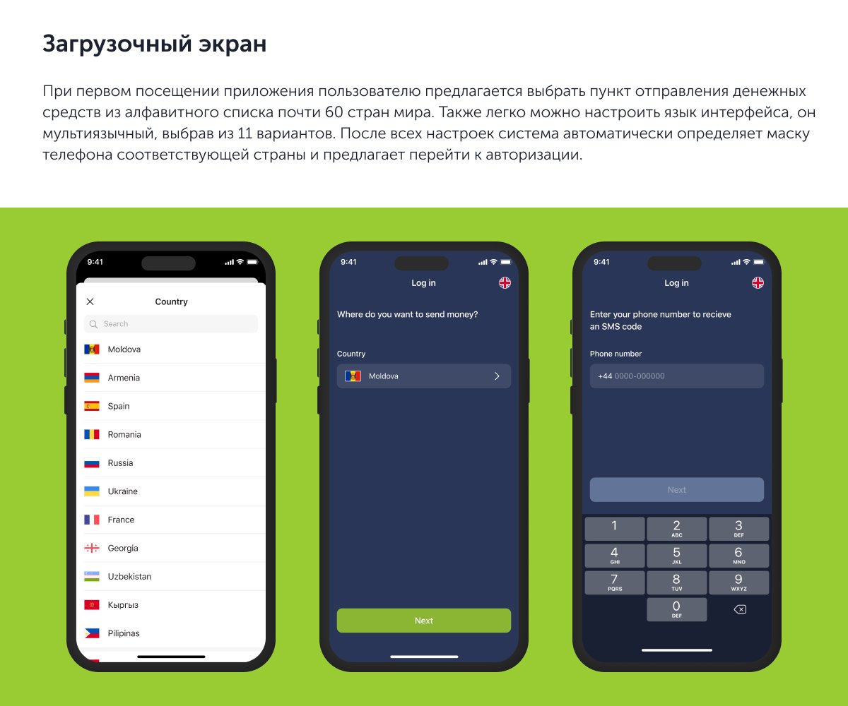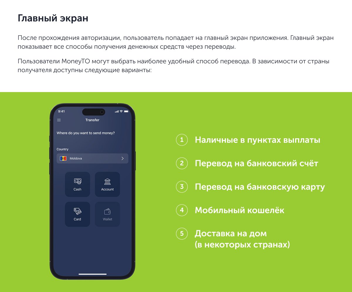 Разработать мобильное приложение для iOS и Android для денежных переводов по номеру телефона, на банковскую карту, на счёт или с получением наличными.