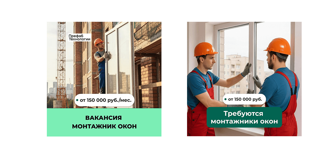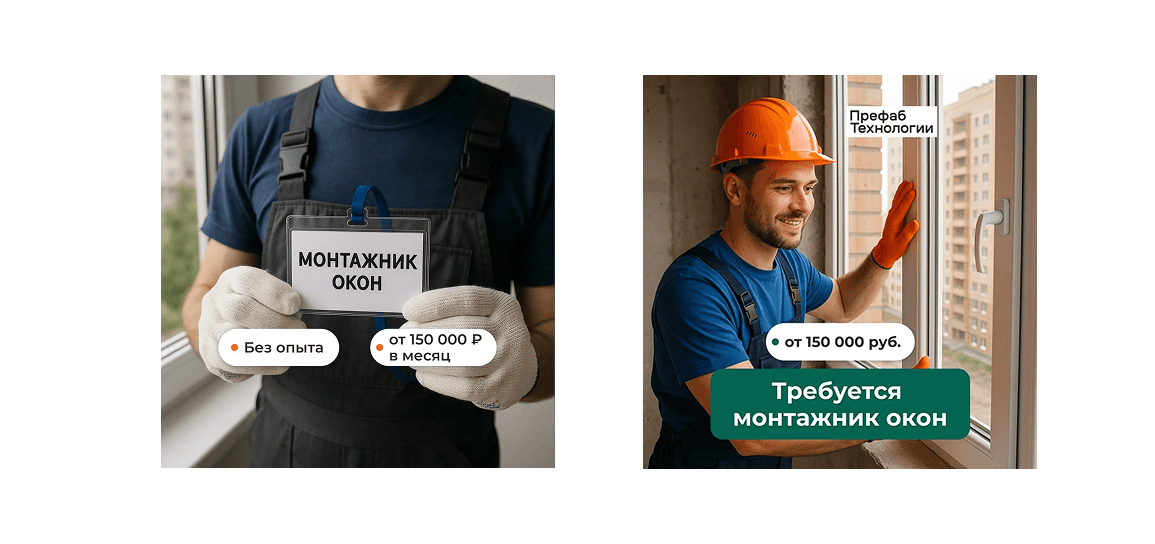 Для привлечения монтажников мы сделали упор на визуальное оформление объявлений. В качестве креативов использовали фотографии монтажников окон на работе. Они помогали сразу показать, о какой профессии идёт речь, и делали рекламу наглядной и понятной для кандидатов.