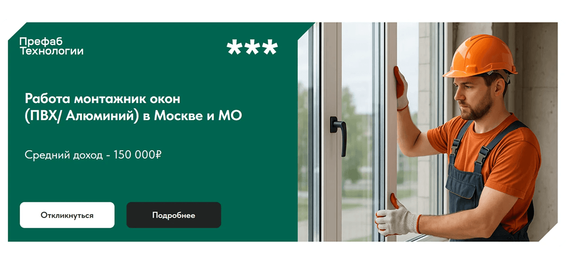 «Монтажник окон. Без опыта. ЗП от 150 000 ₽»
