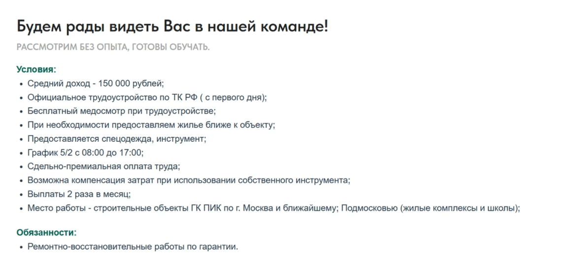 В текстах объявлений мы делали упор на чёткость и конкретику. Кандидат сразу видел, какая профессия требуется, нужно ли иметь опыт, и какой уровень заработка. Такой подход помогал человеку быстро понять, подходит ли ему эта работа, и принять решение об отклике.