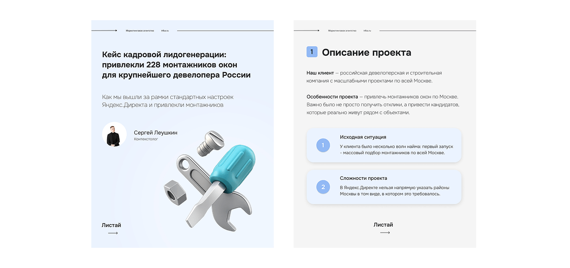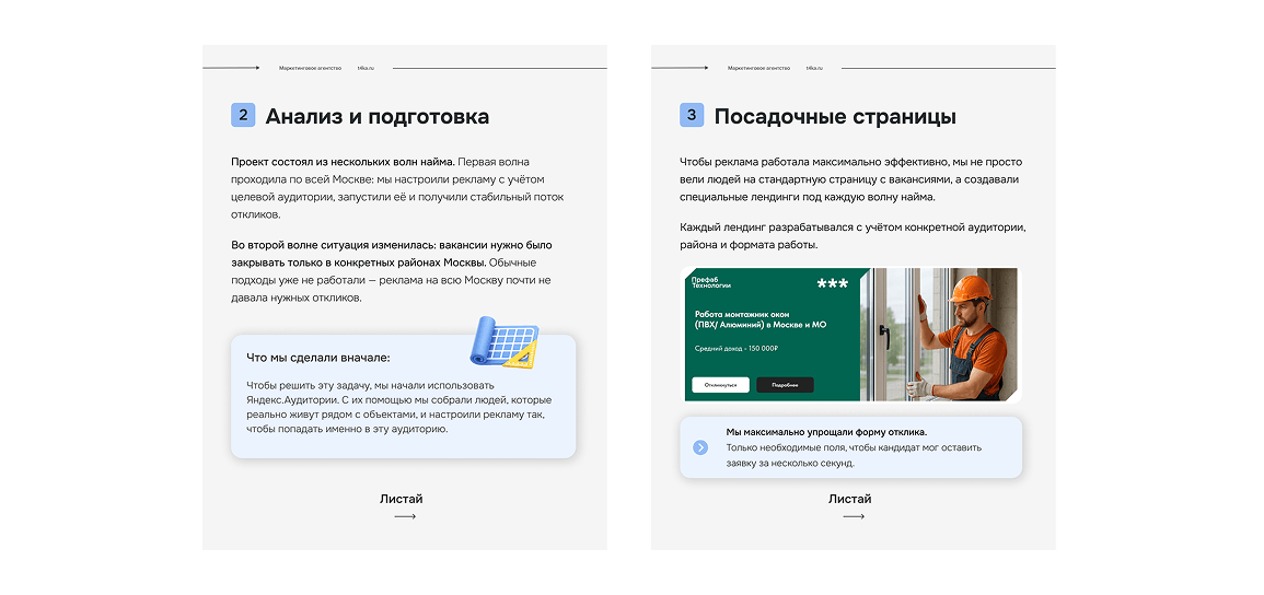 На первый взгляд задача выглядела стандартной — найти монтажников окон в Москве с помощью контекстной рекламы. Но важно было не просто собрать отклики, а привлечь кандидатов, которые действительно живут рядом с объектами, готовы оперативно приступить к работе и не пропадают после первого звонка.