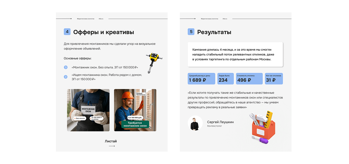 «Важно не просто запустить рекламу, а выстроить её правильно — от точной аудитории до креативов и посадочных страниц. Если хотите получать такие же стабильные и качественные результаты по привлечению монтажников окон или специалистов других профессий, обращайтесь в наше агентство — мы умеем превращать рекламу в реальные заявки»