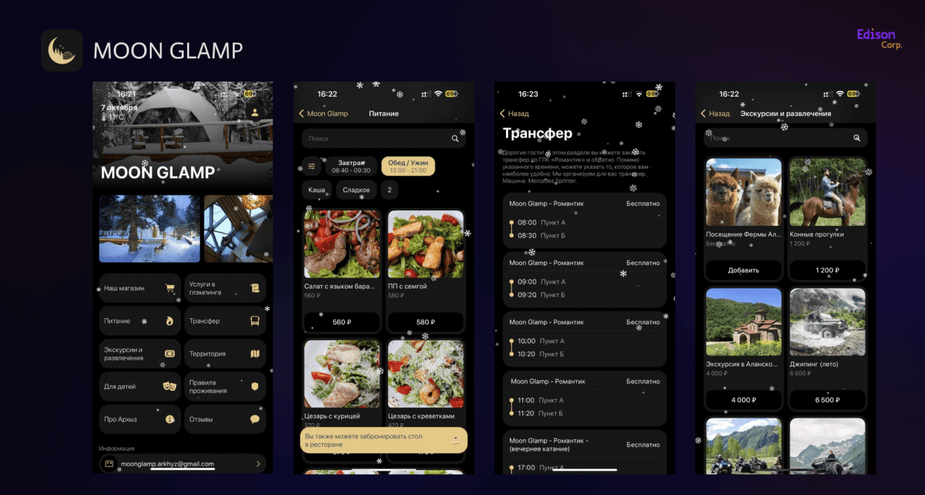 Красивое и удобное приложение для гостей глэмпинга дает возможность заказывать услуги отеля и курорта привычным для всех способом, больше не нужно звонить на ресепшн, гуглить и ломать голову над тем "как же организовать свой досуг ?" Можно отправлять пуши гостям, также, гости смогут бронировать отель прямо через приложение. Все гости отеля заказывают услуги только через мобильное приложение, более 2000 тысяч скачиваний за два года у глэмпинга с 7 куполами!