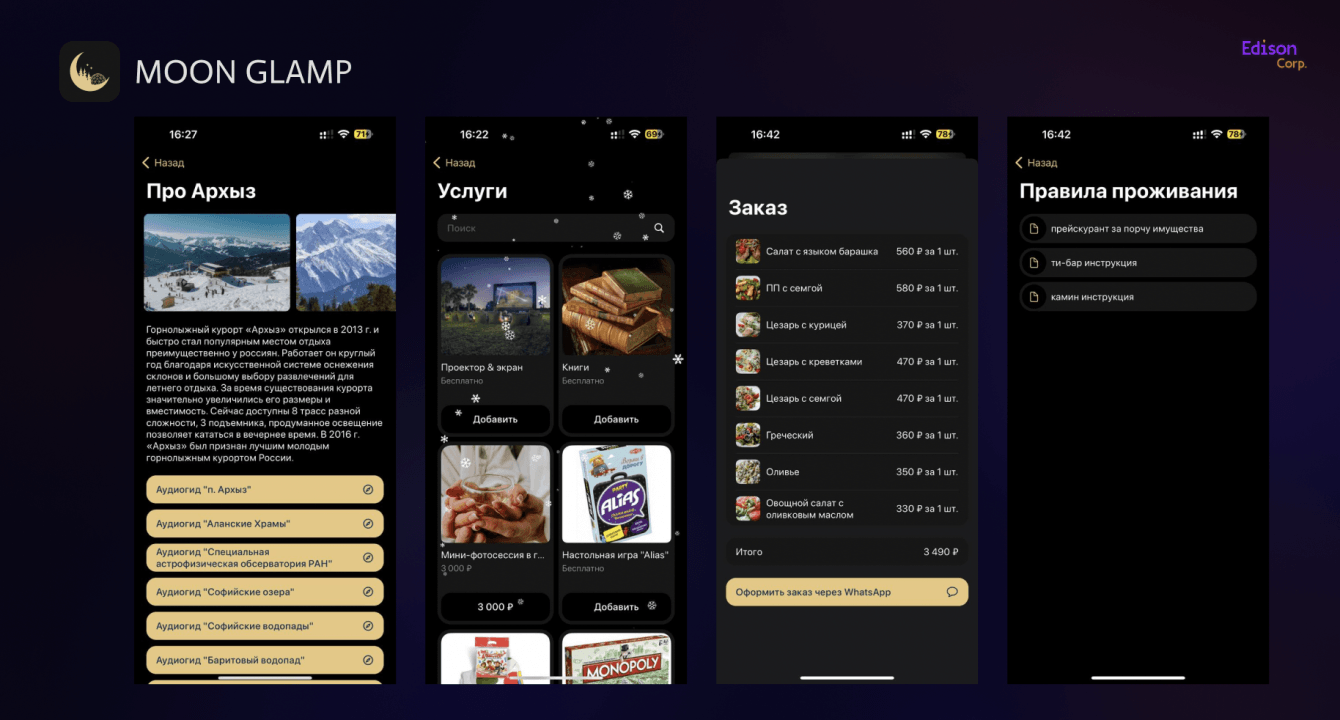 Красивое и удобное приложение для гостей глэмпинга дает возможность заказывать услуги отеля и курорта привычным для всех способом, больше не нужно звонить на ресепшн, гуглить и ломать голову над тем "как же организовать свой досуг ?" Можно отправлять пуши гостям, также, гости смогут бронировать отель прямо через приложение. Все гости отеля заказывают услуги только через мобильное приложение, более 2000 тысяч скачиваний за два года у глэмпинга с 7 куполами!
