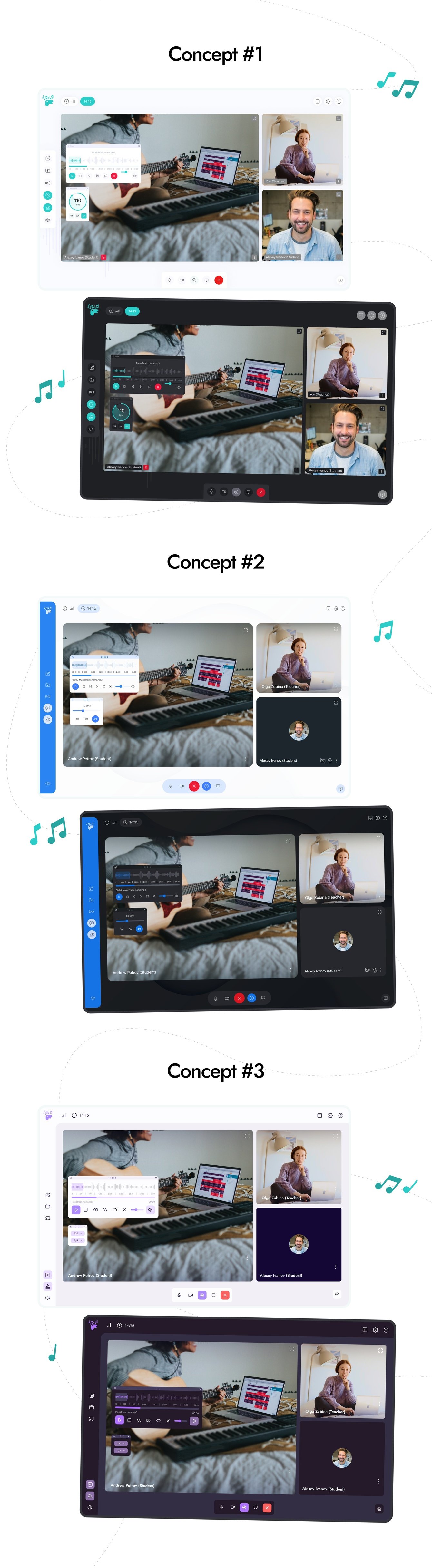Клиенту понравился Concept #3, как разделяется верхняя и боковая панель от центральной области, а так же плеер и иконки. По цветовой гамме и проработке метронома больше понравился Concept #1. Мы зафиксировали все пожелания и приступили к детальной прорисовке макетов.