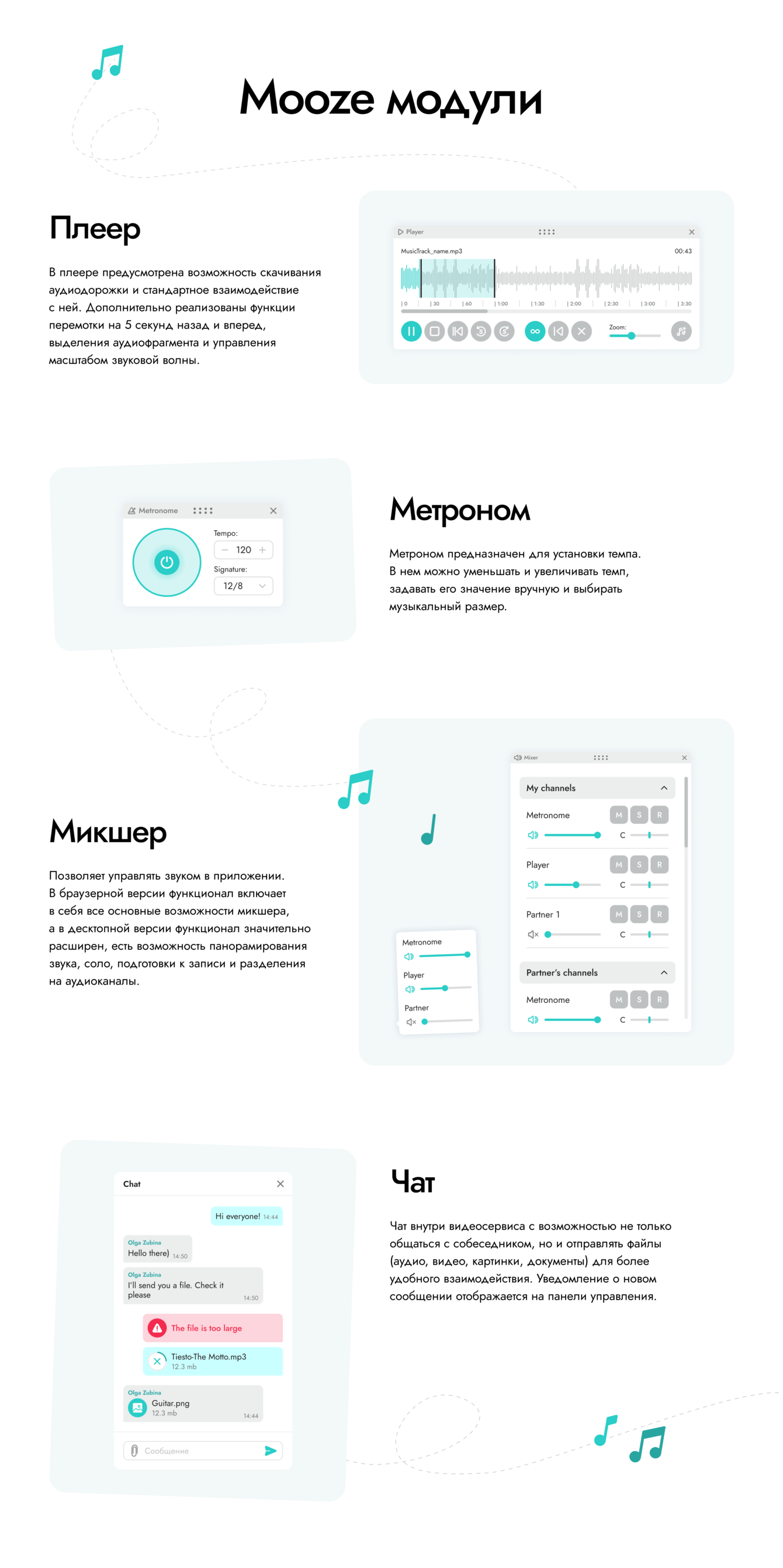 С модулями Mooze все необходимые функции под рукой. Нет необходимости покидать приложение и искать метроном или плеер в сторонних сервисах. Не нужно искать системные настройки звука, ведь с помощью микшера можно настроить громкость метронома, плеера, партнеров. А с помощью чата можно отправлять сообщения и файлы. И все это в одном пространстве.