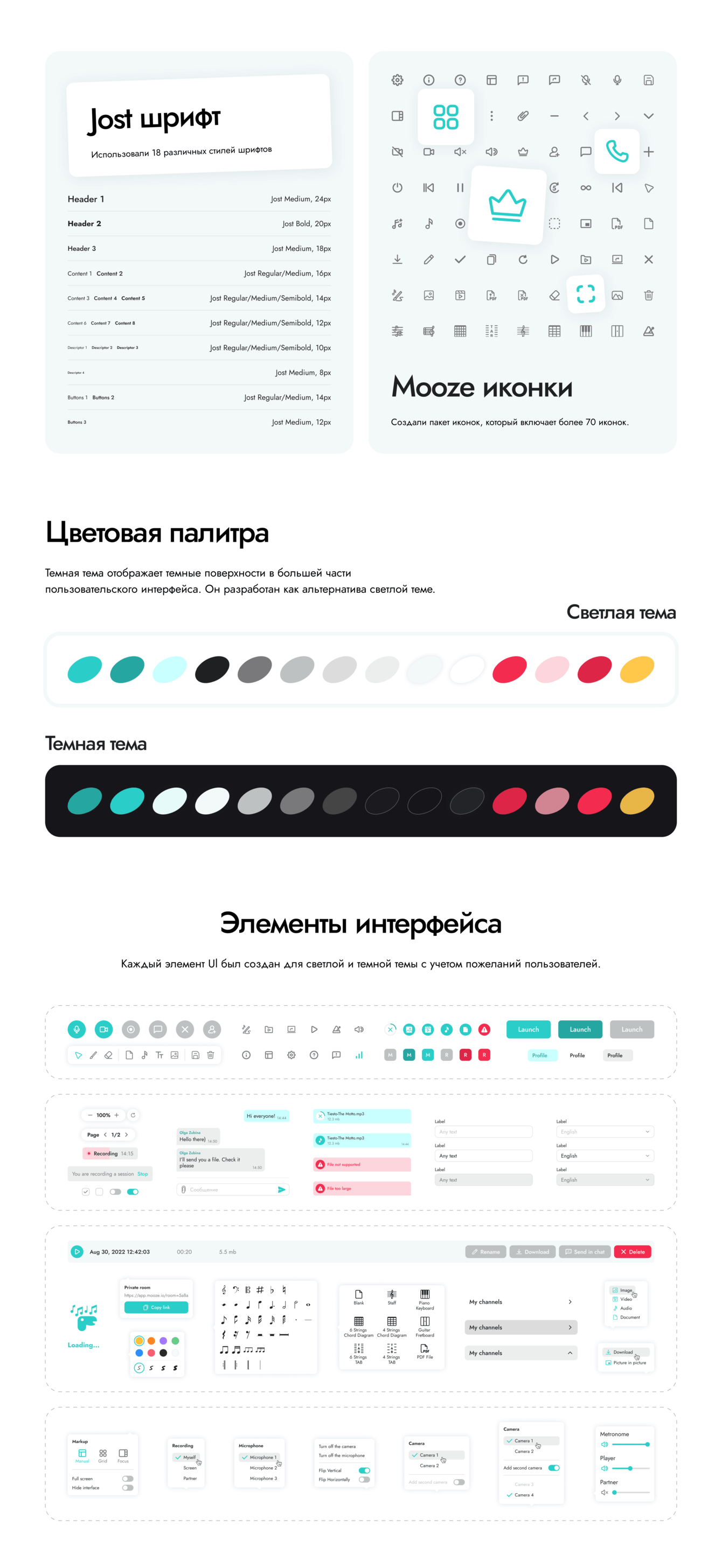 Команда Mooze обратилась к нам за помощью в разработке визуального стиля приложения. Нам предоставили детальные прототипы и Moodboard. Так же необходимо было уделить особое внимание при разработке таких модулей, как метроном, плеер, микшер.