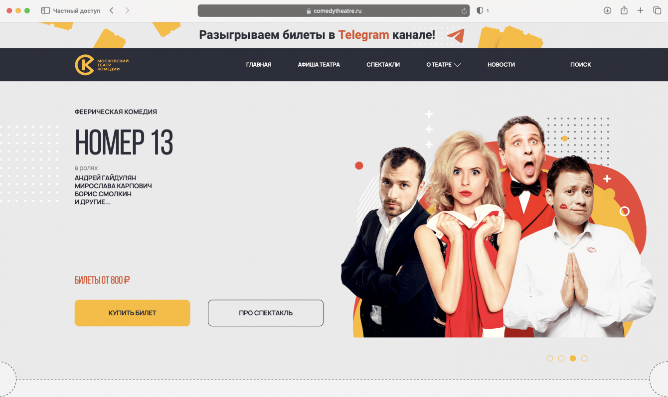 Cоздание сайта, для тех, кто хочет ознакомиться с афишей театра, выбрать для себя подходящий спектакль по участвующим в нем актерам. С помощью нового яркого визуального контента формировать образ бренда у аудитории.