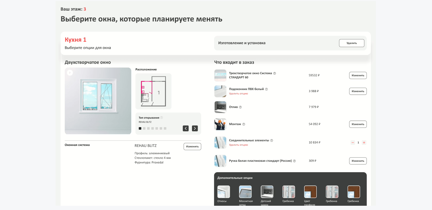 Пользователь вводит адрес и выбирает планировку квартиры. Система автоматически подтягивает данные о размерах окон и балконов, что исключает необходимость выезда замерщика.