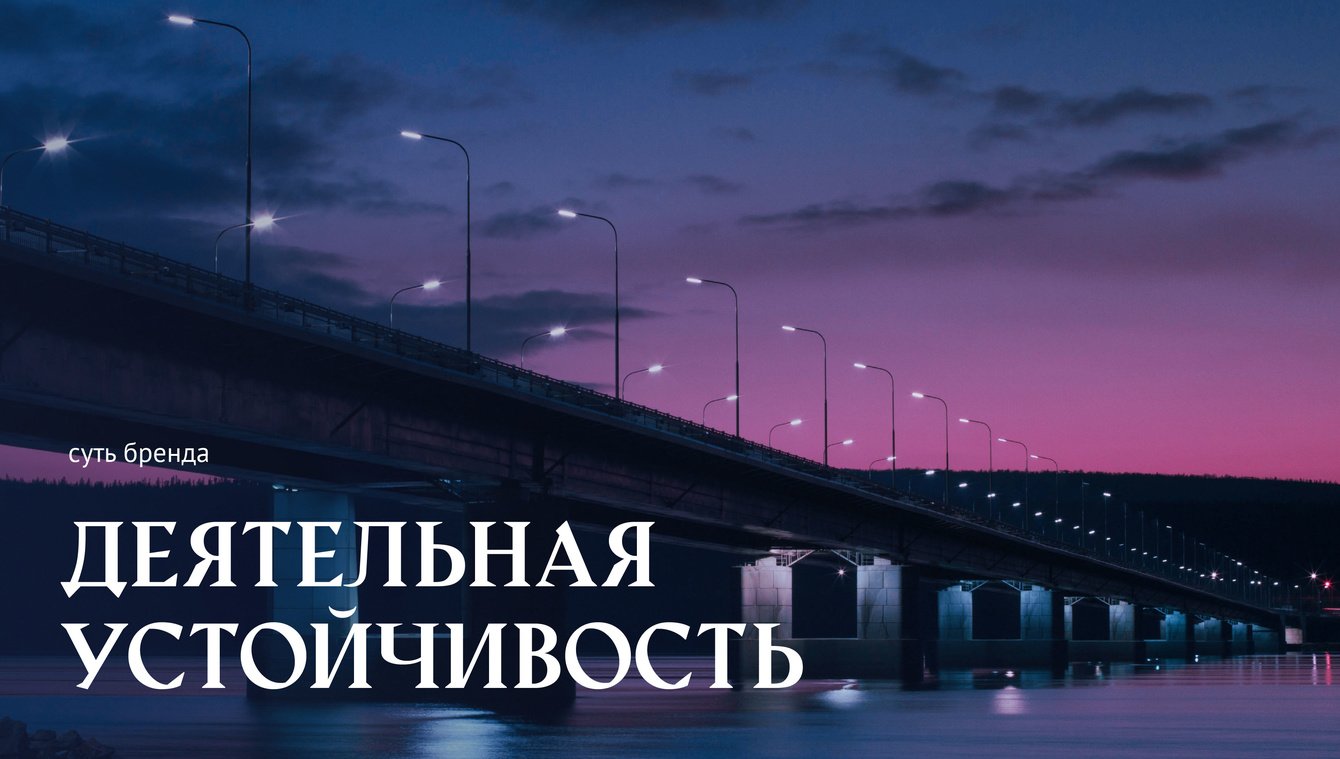 Исходя из этих основ, сформулировали суть бренда — деятельная устойчивость. Формулировка сути отражает главное и важное: «мы сохраняем постоянство в реализации задач год за годом уже более ста лет».