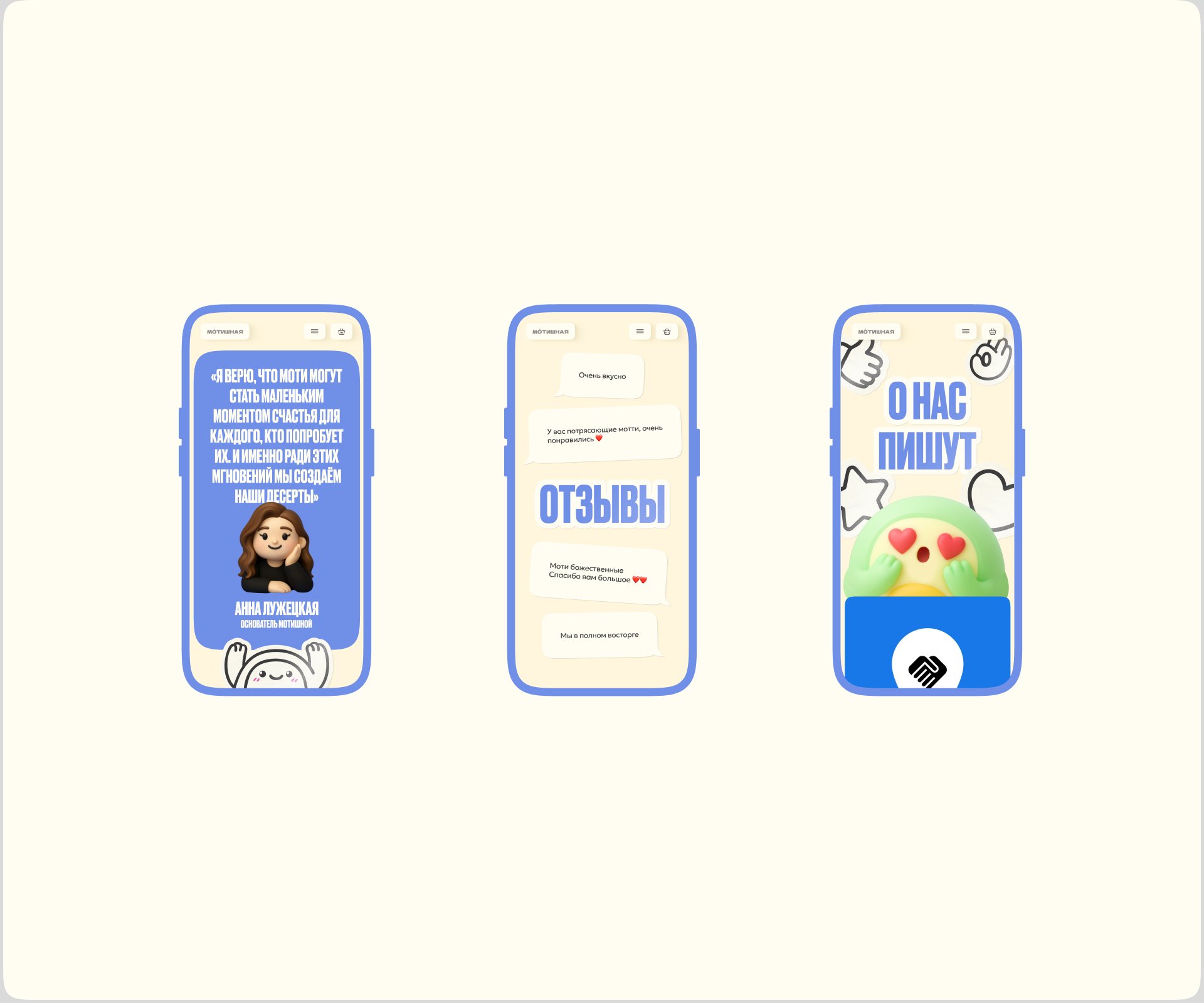 «Мотишная» — это авторский бренд нежных десертов моти, созданный с любовью и вдохновением к японской культуре и домашнему теплу. Главная идея проекта — сделать моти не просто десертом, а эмоциональным опытом: чем-то уютным, тёплым и трогательным, как воспоминание о детстве.