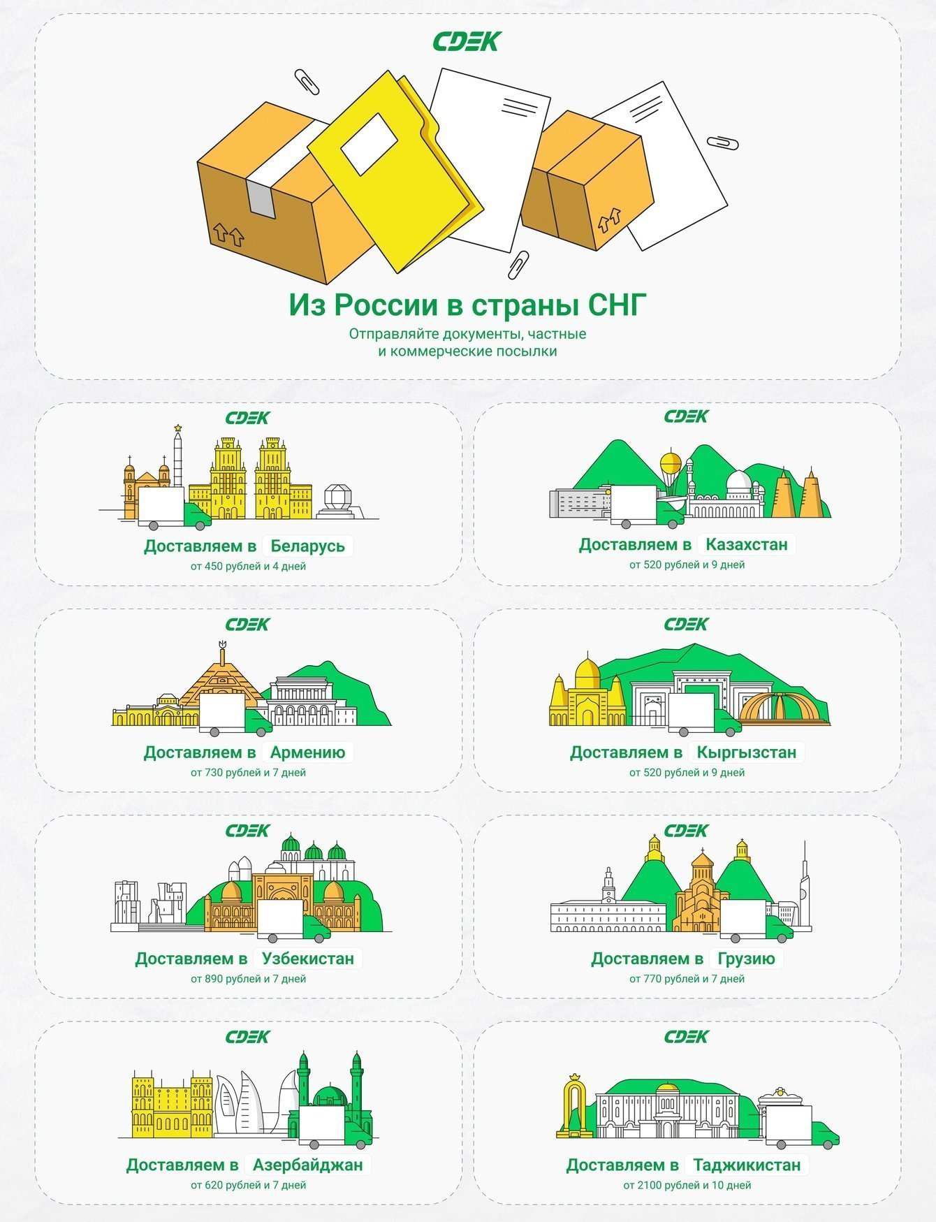 Линейные иллюстрации. В рамках этого подхода использовована линейная графика с акцентными пятнами фирменного цвета. В этой визуальной рамке использованы готовые персонажи и элементы: коробки, грузовики, конверты.