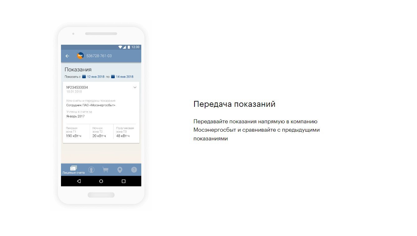 - Передача показаний. Передавайте показания напрямую в компанию "Мосэнергосбыт" и сравнивайте с предыдущими показаниями.