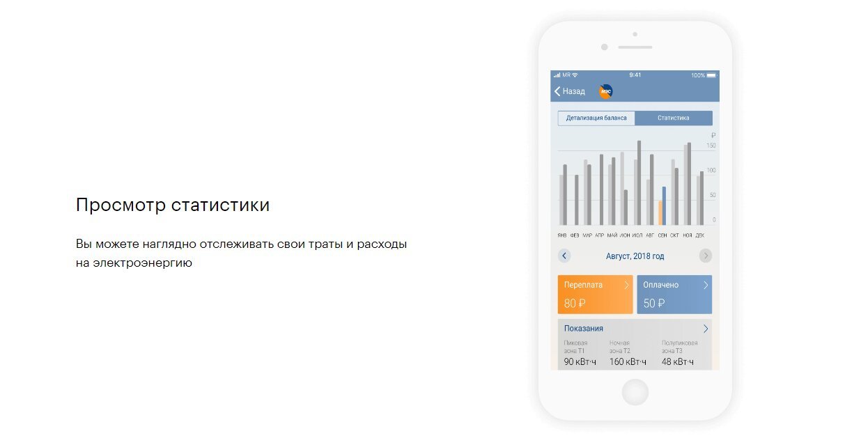 - Просмотр статистики. Вы можете наглядно отслеживать свои траты и расходы на электроэнергию.