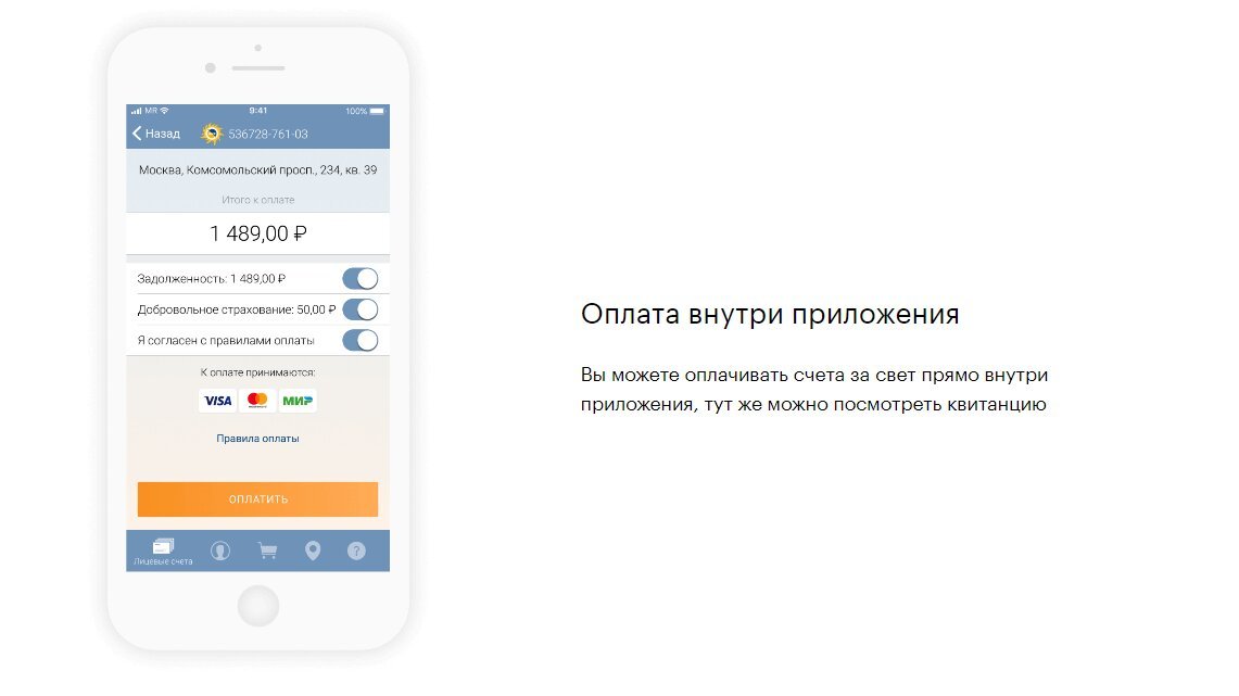 - Оплата внутри приложения. Вы можете оплачивать счета за свет прямо внутри приложения, тут же можно посмотреть квитанцию.