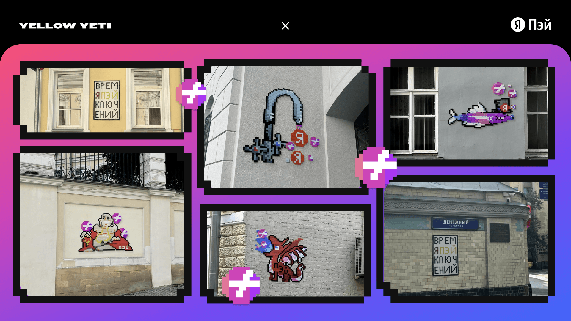 Создали мозаичные арт-объекты с визуальным брендингом Яндекс Пэй и разместили их на улицах Москвы (например, на улице Денежной). Для создания арт-объектов совместно с художником использовали настоящую мозаичную технику.