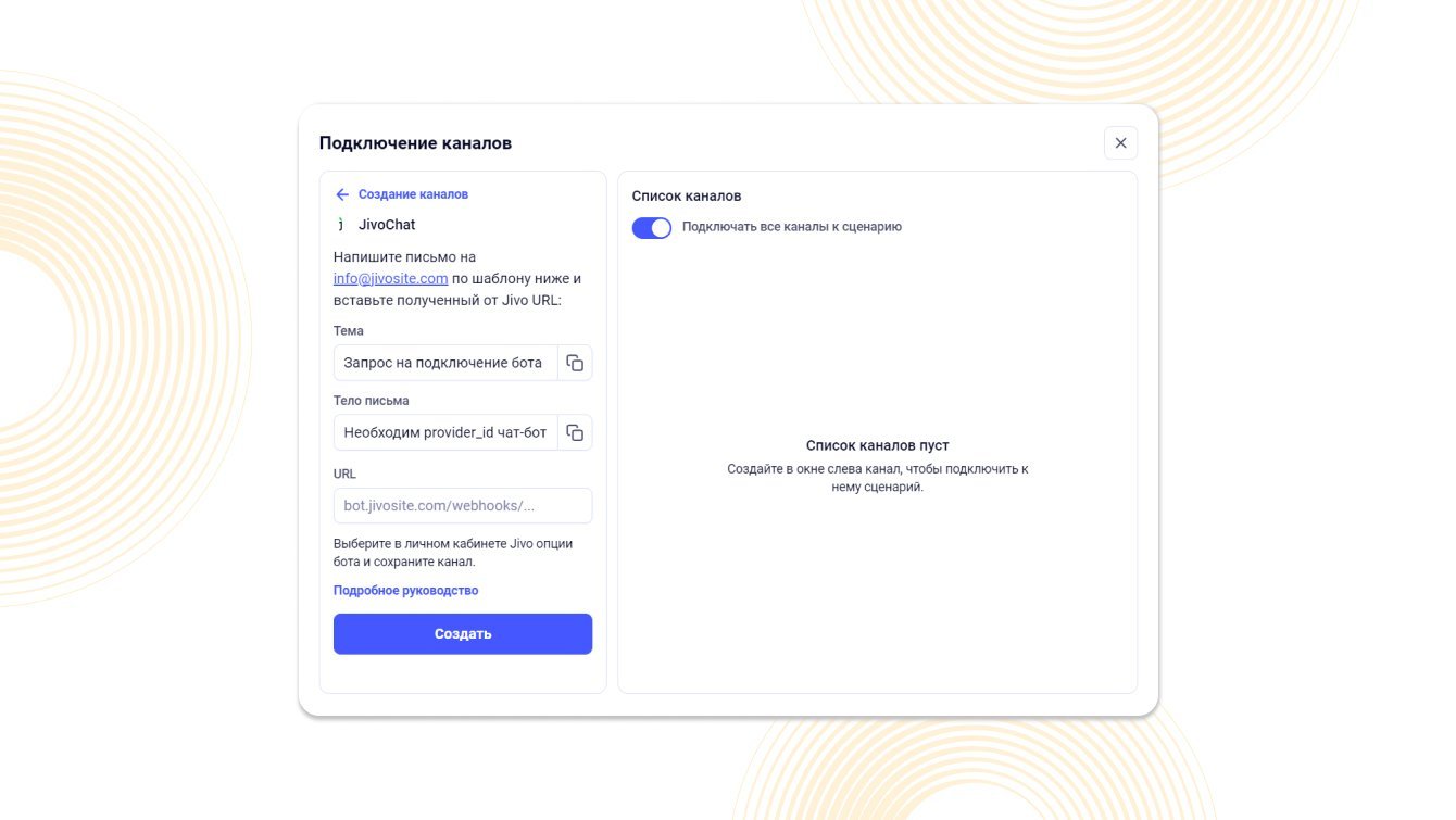 К сценарию мы подключили уже существующий канал заказчика — JivoChat.