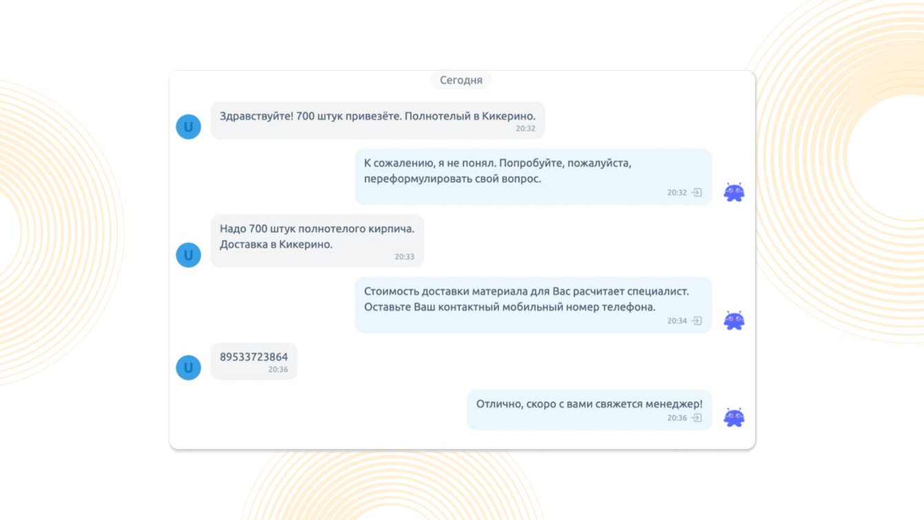 Таким образом, мы встроились в текущий бизнес-процесс клиента и автоматизировали его с помощью умного бота. Для клиентов компании-производителя строительных материалов ничего не поменялось, а менеджеры получают заявки от чат-бота.