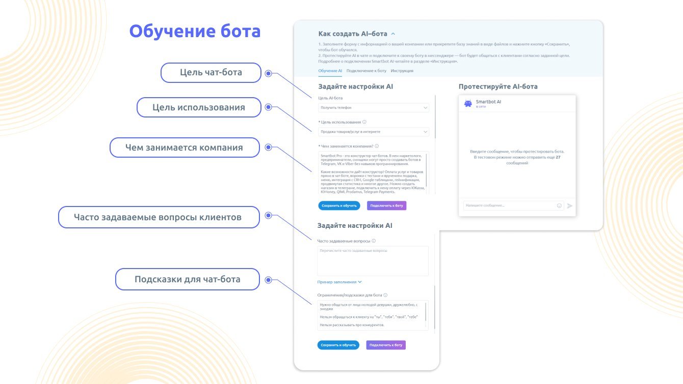 В режиме Smartbot AI мы обучили бота по базе знаний клиента, а именно внесли информацию о компании, сайт, часто задаваемые вопросы, ограничения и подсказки в диалоге с заказчиком.