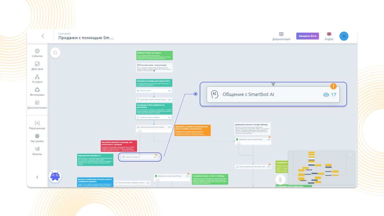 После обучения бота мы настроили сценарий диалога и внедрили блок с Smartbot AI.