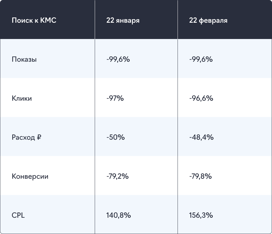 Важно отметить, что в нашем случае хорошо отработали КМС кампании. Рассмотрим статистику за январь и февраль 2022 года: