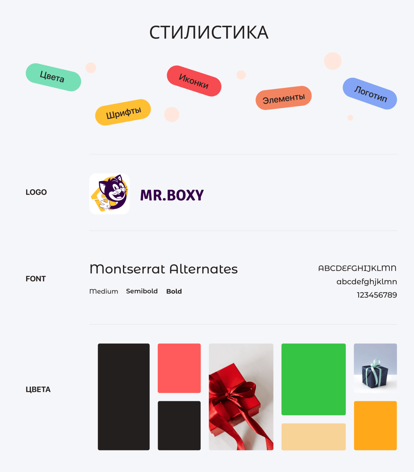 Мы разработали логотип с котом, который держит подарок, проходя через этапы исследования, создания эскизов, цифровизации, выбора цветовой схемы, тестирования и коррекции, в итоге достигнув идеальной финальной версии; в дизайне мы использовали светлую тему с чистыми оттенками, чтобы создать впечатление легкости и яркости, а также добавили праздничный оранжевый цвет для подчеркивания радостного и позитивного настроения, что согласуется с концепцией подарков и создает привлекательный и уютный образ сервиса; кроме того, в дизайне мы применили шрифт Montserrat Alternates, который отлично сочетается с выбранной стилистикой благодаря своей чистоте, современности и четкости, создавая гармоничный образ и придавая сервису элегантный и профессиональный вид.