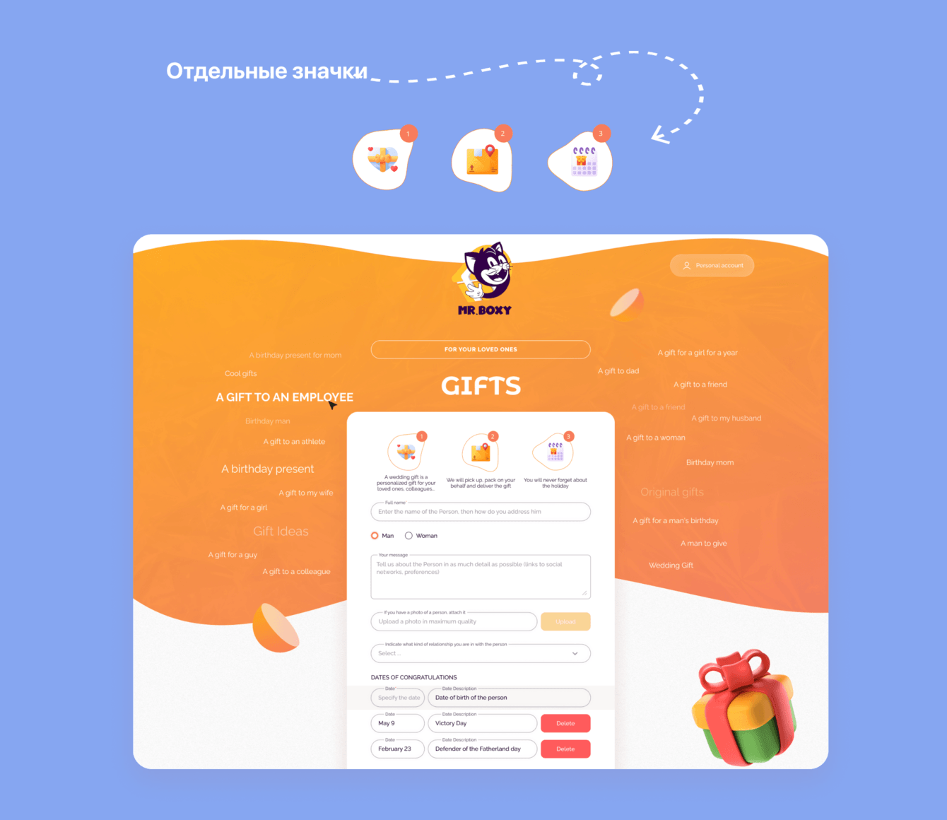 К нам обратился клиент с просьбой создать инновационное приложение и веб-сайт, который поможет пользователям найти идеальные подарки для своих коллег, родственников, друзей и других близких людей. Клиент хочет, чтобы сервис предлагал персонализированные подарки, учитывая информацию о получателе, такую как его интересы, хобби, возраст, предпочтения и бюджет.