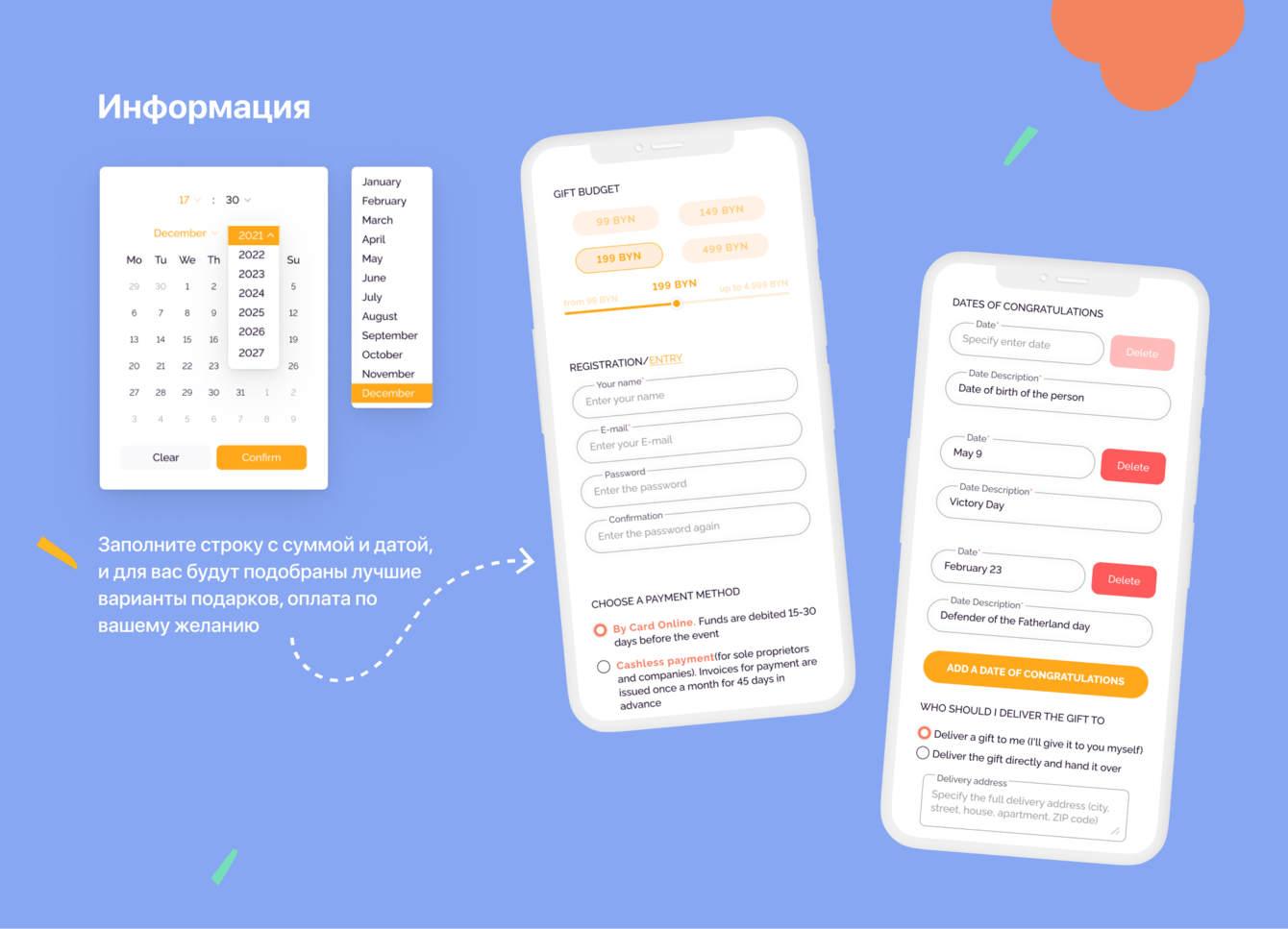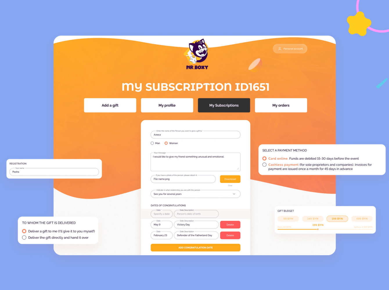 Подбор подарков на основе введенных параметров и персональных данных получателя.
