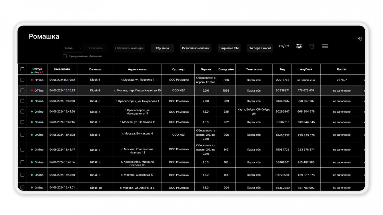 В таблицу можно вывести любой настраиваемый параметр, настройки удаленного доступа, включение/отключение способов оплаты, историю изменений, фильтры по параметрам, записать дополнительную тех. информацию чтобы не искать ее в других источниках. Есть возможность создать или удалить новое устройство, открыть или закрыть, включить, выключить, перезагрузить.