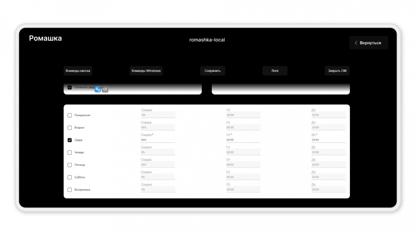 Каждый микромаркет имеет свою настройку, где индивидуально можно задать режим работы скидок на товары.